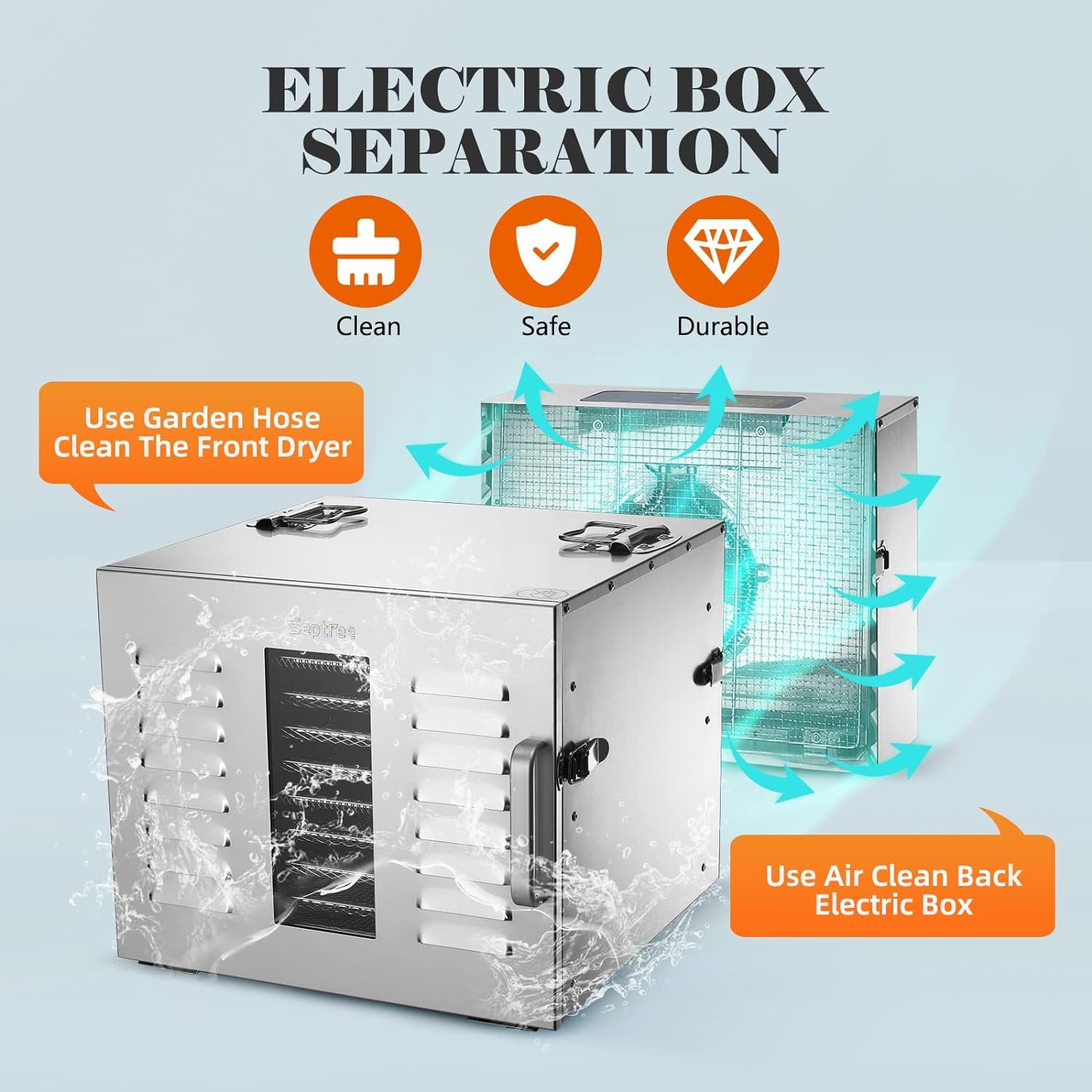 【Easy to Clean & Satisfaction Service】The back electric box of the dehydrator can separation, use garden hose clean the front dryer and air clean back. The stainless steel trays and the drip tray at the bottom of the beef jerky dehydrator machine are all removable, dishwasher-safe and easy to clean for your convenience. We offer a long warranty period for 3 years (from the date of purchase), if you encounter any problems, please feel free to contact our customer service.