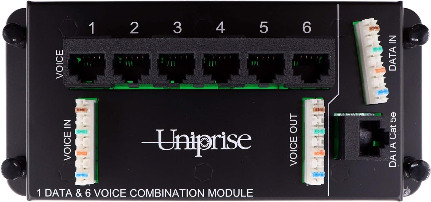 COMMSCOPE UNMDU-CDM-1D/6T CC0061994/1 UNIPRISE DATA & VOICE COMBO PATCH PANEL MODULE FOR STRUCTURED MEDIA SYSTEMS. Ideal for use with Home Automation MDU /SMC panels. Pegs fit most SMC Enclosures. This module supports the follow outputs: 6x Voice Jacks (RJ11), 1x Cat5E Data Jacks (RJ45). (1) Data (1) Voice Input are both 110-Style Punch-Down inputs. Use Multiple Modules in Series for expansion, or combine with additional Data Modules for CAT6 expansions. Combine with Commscope UNMDU-DDM-8-C6 Cat6 Data Modules.
