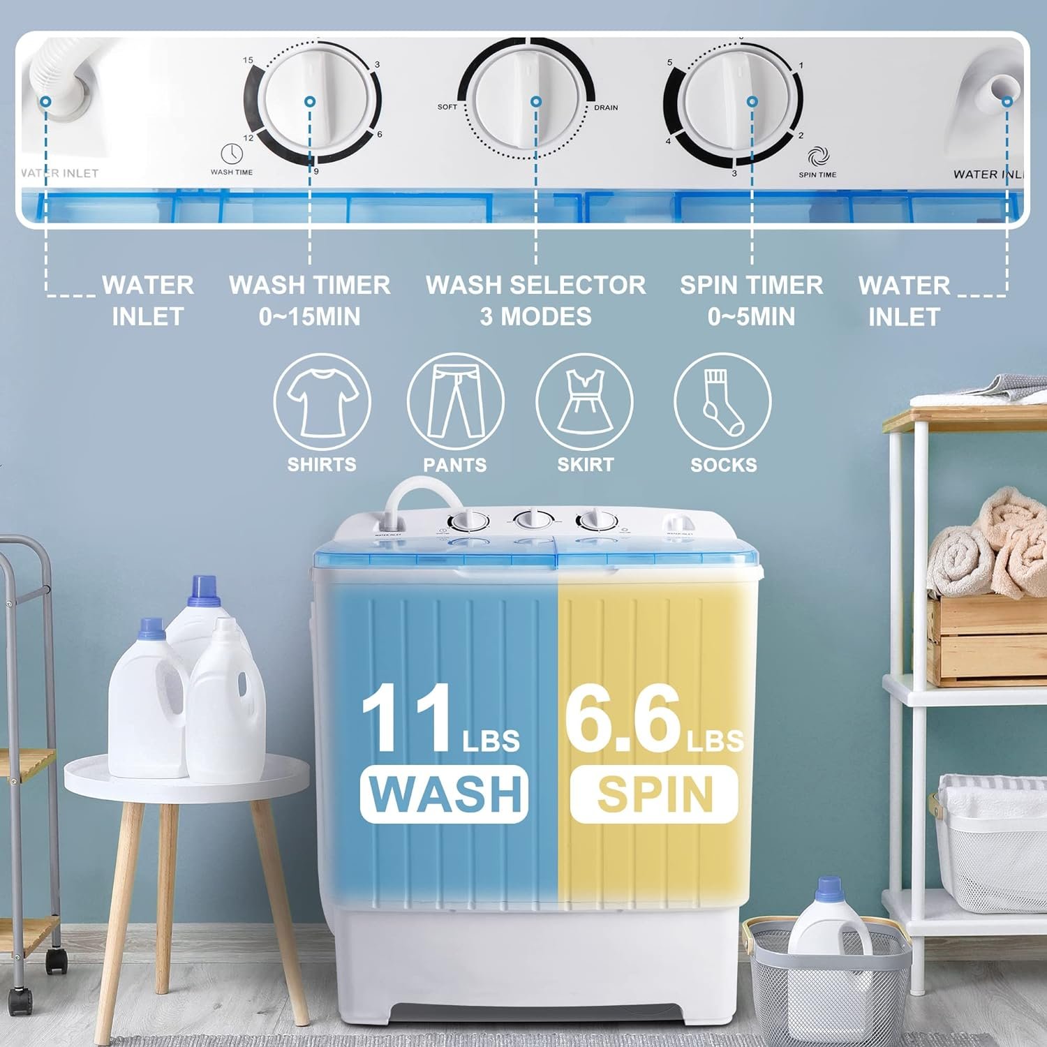 🌊【Twin Tub Design】The portable washing machine features a unique twin tub design, allowing you to wash and spin dry your clothes simultaneously. With separate compartments for washing and spinning, you can conveniently handle different loads of laundry at the same time.