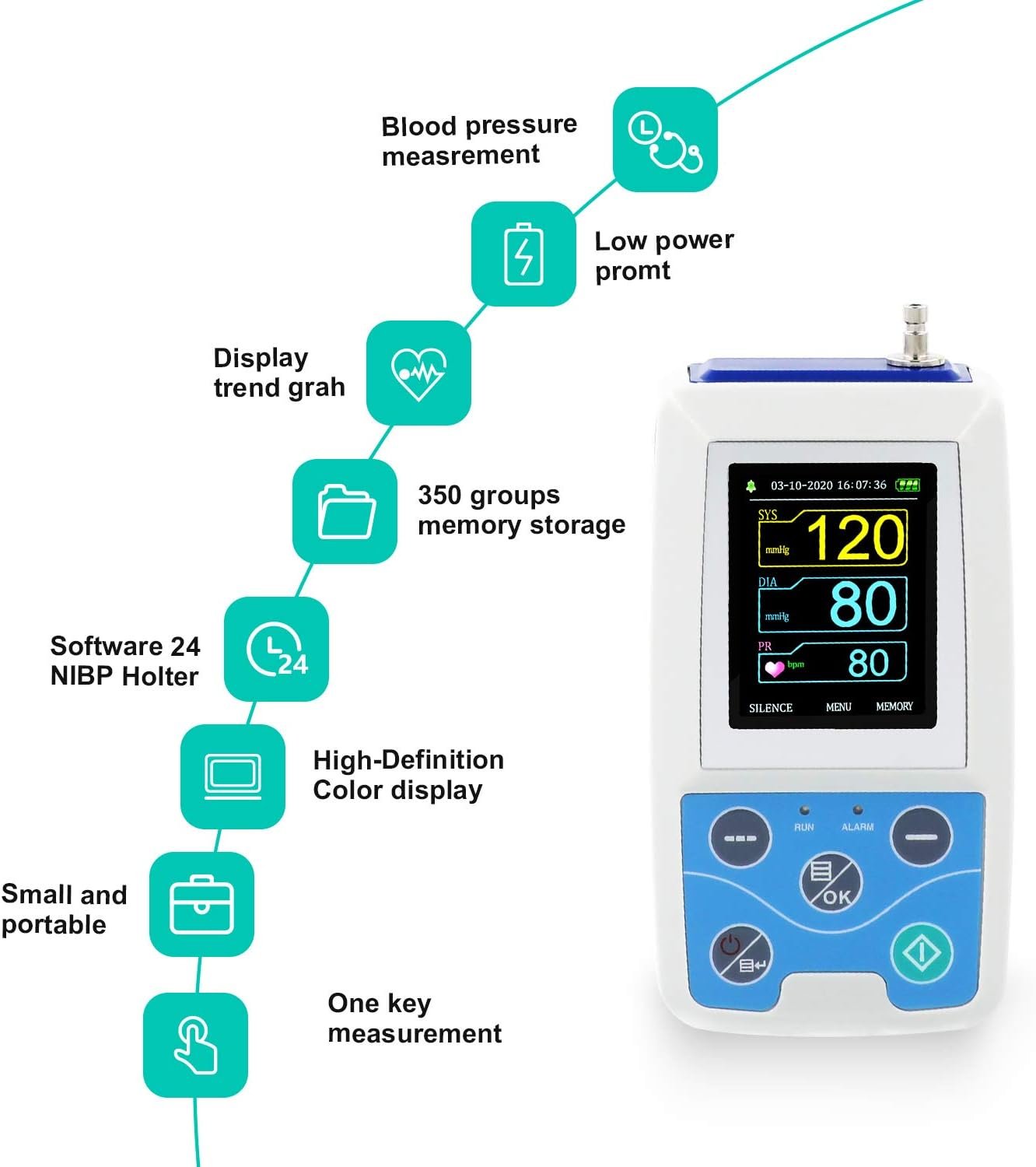 4.Our ABPM50 ambulatory blood pressure monitor is compact and portable.Up to 350 groups of ambulatory NIBP data can be recorded for once.It is with High-definition color TFT display,strong visibility.