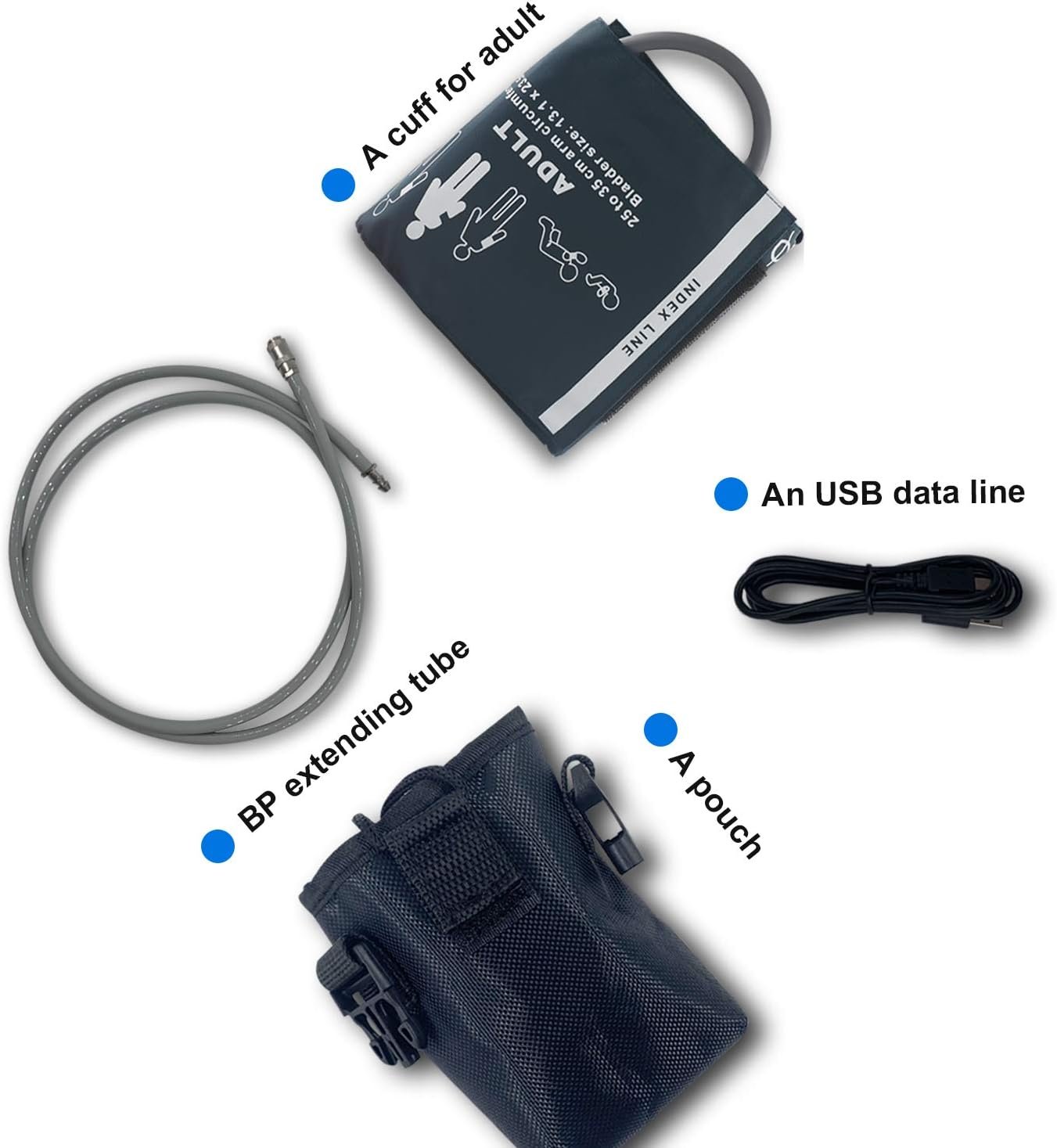 3.Accessories included in the package:①One adult cuff②Free downloadable PC software③carrying bag④USB cable