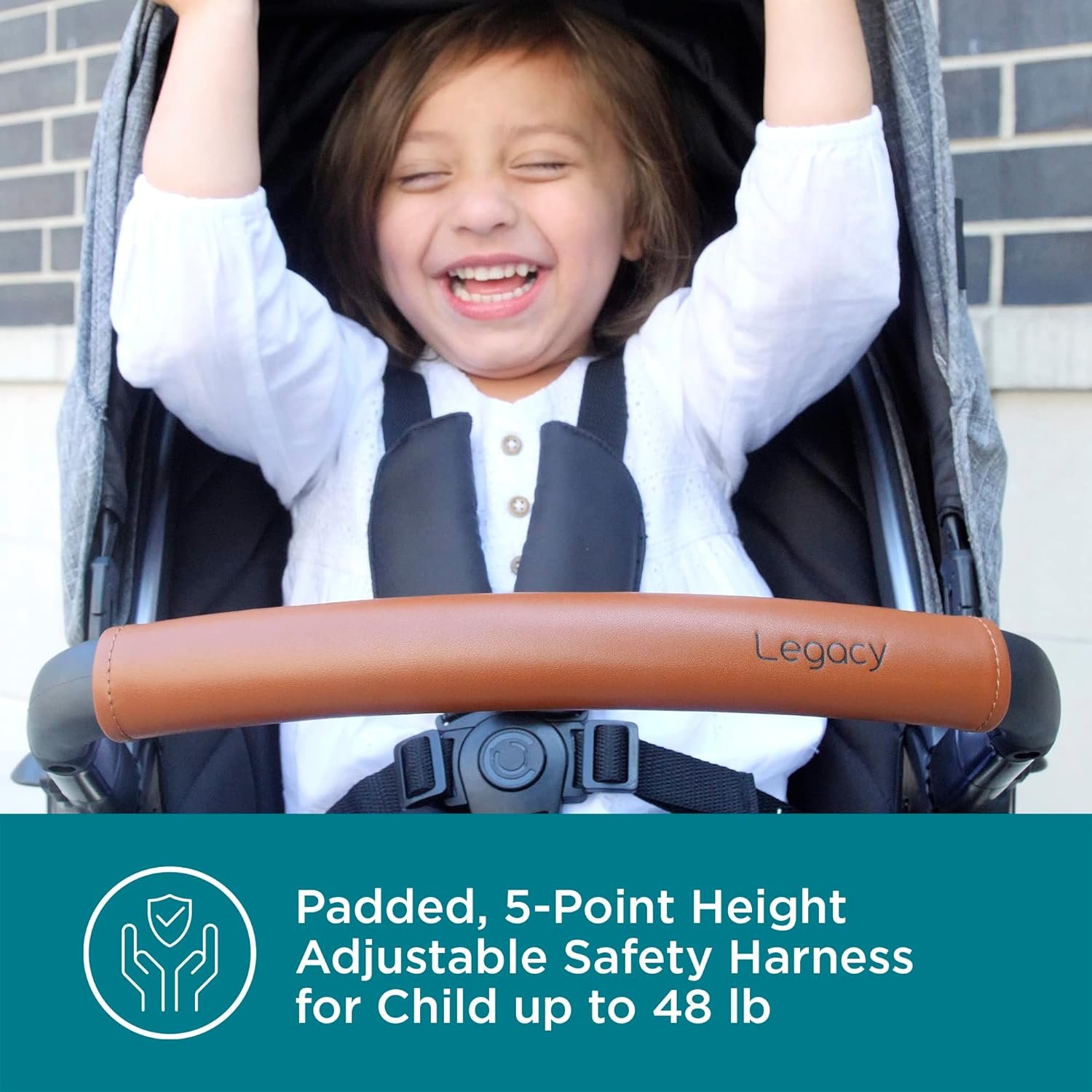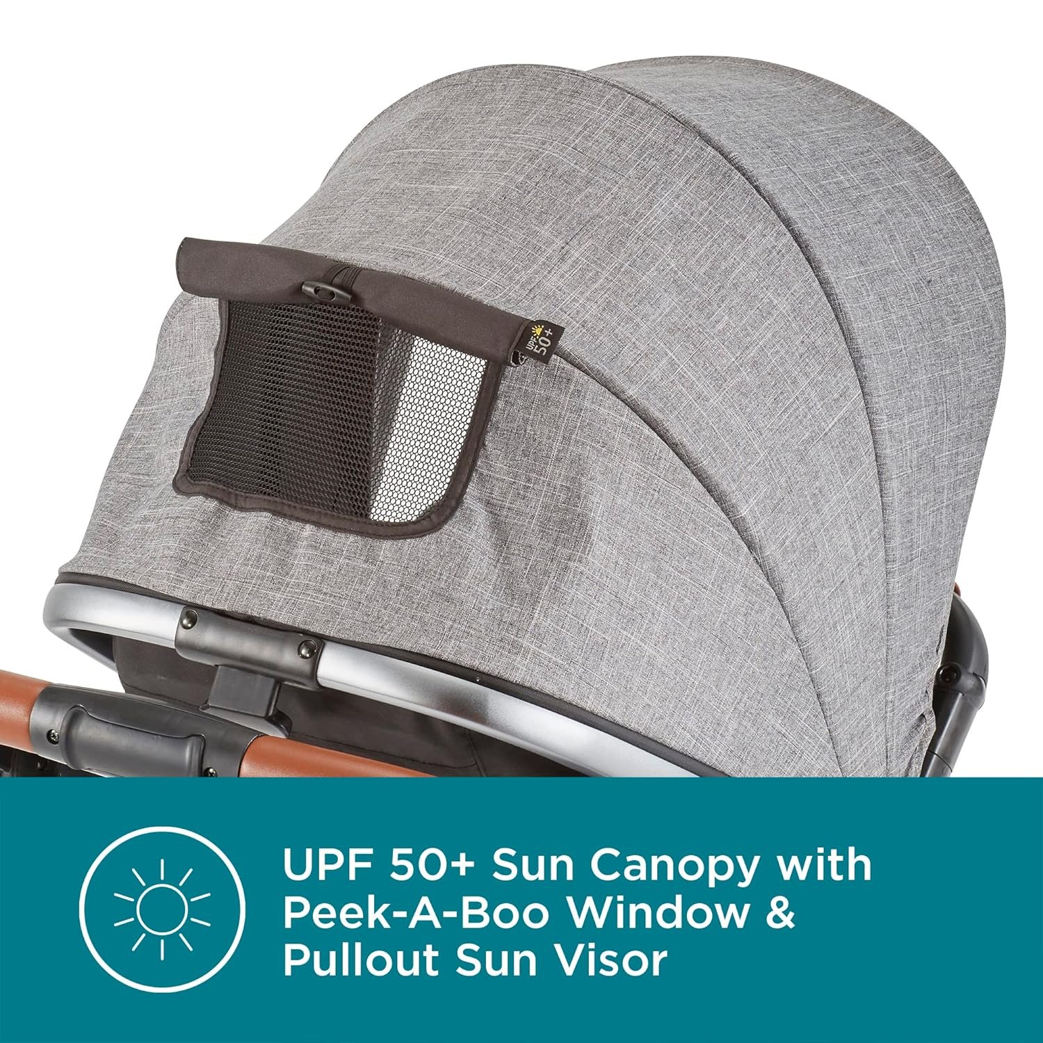 PREMIUM FEATURES: Leatherette stroller handle and napper bar, sandal-friendly rear wheel brake, UPF 50 plus sun canopy with peek-a-boo window, and 5-point safety harness with adjustable shoulder straps