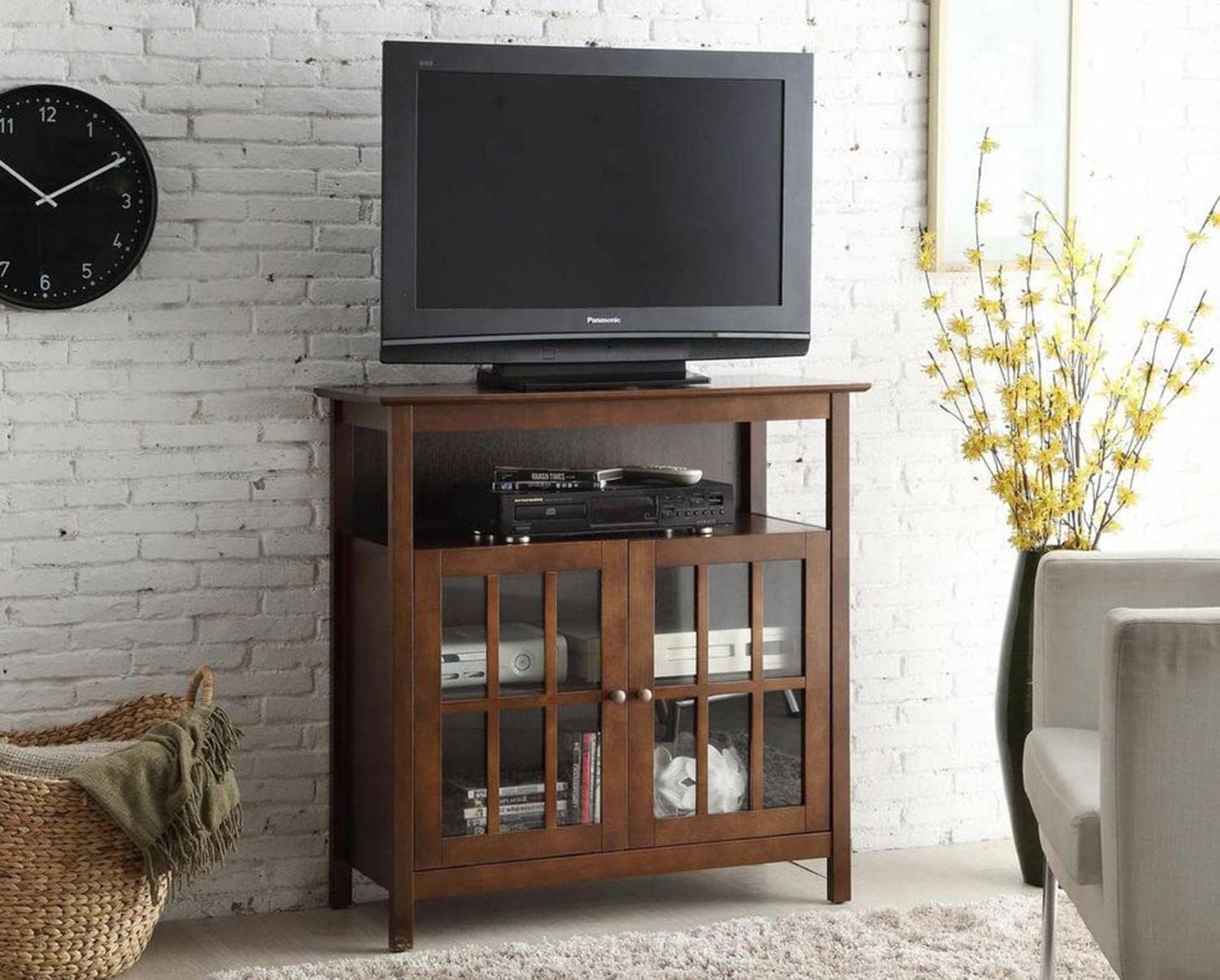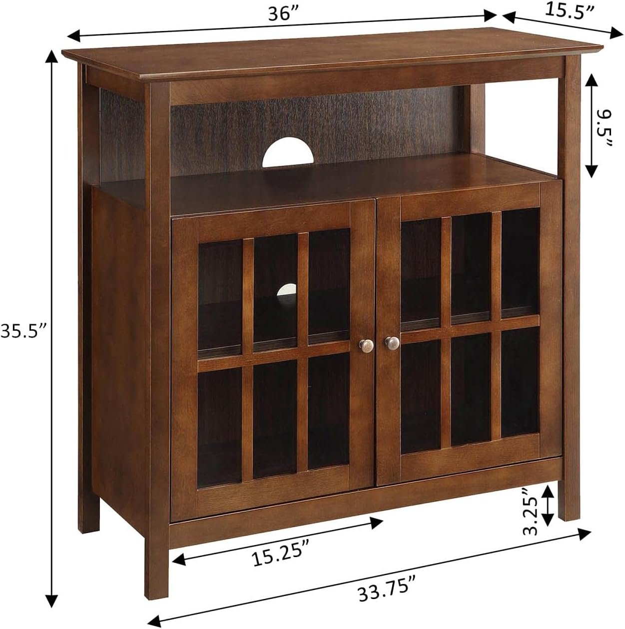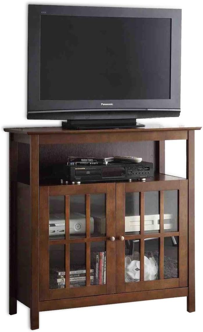 Upgrade your entertainment space with the Big Sur Highboy TV Stand with Storage Cabinets by Convenience Concepts. Set the TV on the top shelf or mount the TV on the wall above the stand to give more space for entertainment essentials and decor. Two exposed tiers of shelving offer plenty of space for a cable box, gaming consoles, and much more. This modern traditional TV stand comes equipped with two cable management holes to avoid the tangling of cords. Two cabinet doors with smooth nickel knobs and tempered glass windows open to two spacious shelves for additional storage and display. This TV stand was built to last thanks to its sturdy construction of real solid pine and birch veneer. Shop the Convenience Concepts Collection today to complete your home décor, each sold separately