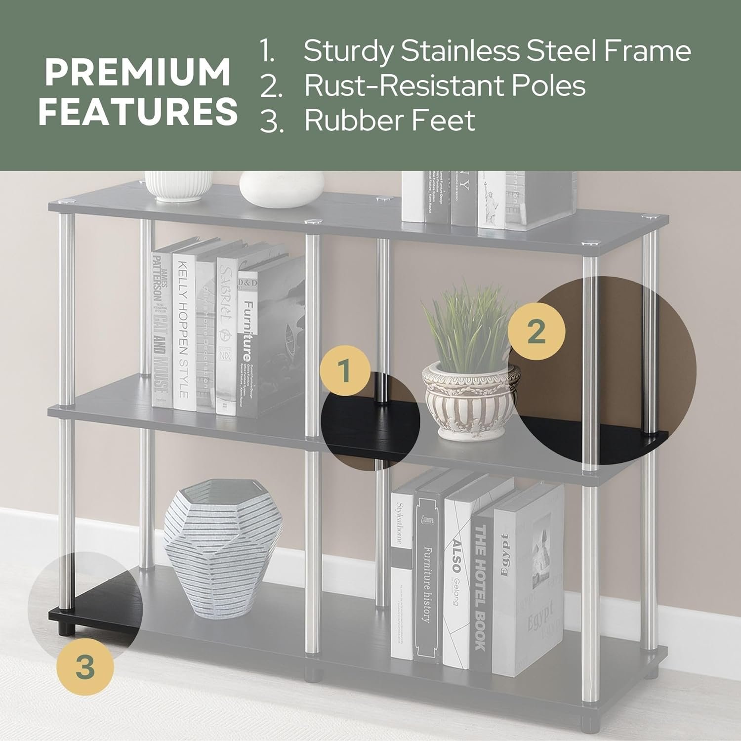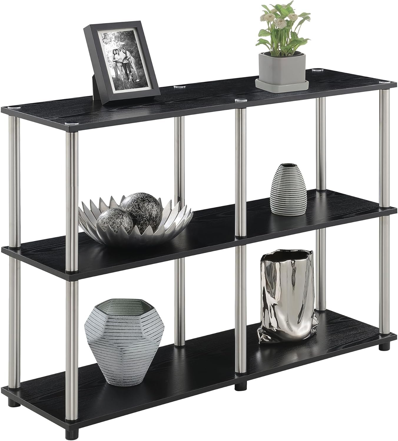 QUALITY MATERIAL: Shelves are engineered of manufactured wood that is supported by stainless-steel legs, making this table stylish and sturdy.