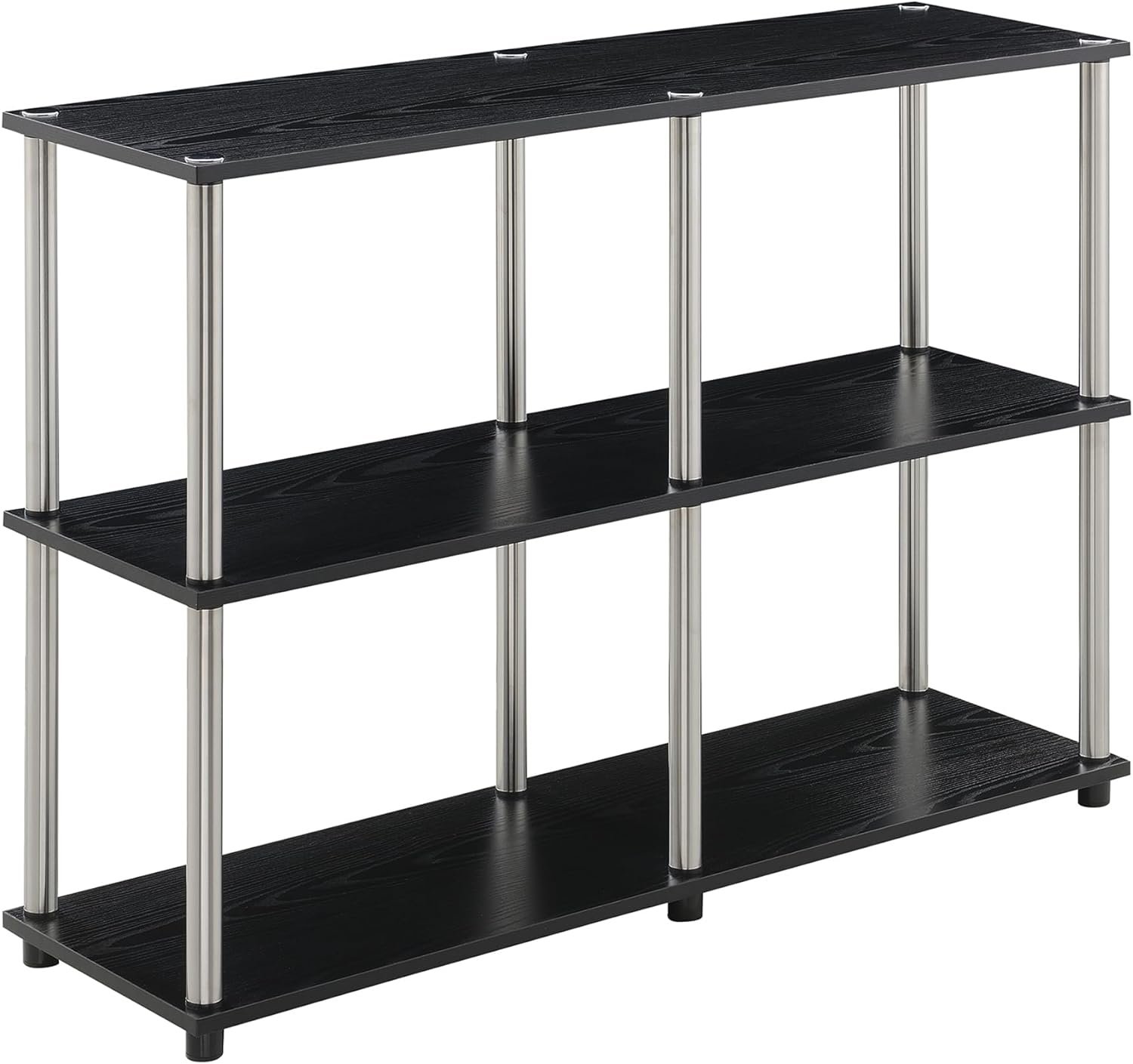 Elevate your office workspace to new heights with the Designs2Go No Tools Console Table with Shelves by Convenience Concepts. Three wide tiers of shelving provide an abundance of space to neatly organize and store additional office supplies. Not limited to just the office; this multi-purpose unit is available in multiple finishes; making it a seamless fit for any room in your home. Possibilities are endless as you can effortlessly pair it with the No Tools Student Desk for a complete office setup or transform it into a captivating TV Entertainment Console. The sturdy frame is rust-resistant and very easy to assemble thanks to the stainless-steel screw-in poles. This piece also includes plastic caps with rubber soles that cover the bottom of each leg to help protect your floors. Each shelf is built from durable manufactured wood and finished with an exquisite woodgrain melamine finish. Convenience truly meets style with its easy no tools needed assembly design. Explore the complete Designs2Go No Tools Collection from Convenience Concepts; each sold separately.
