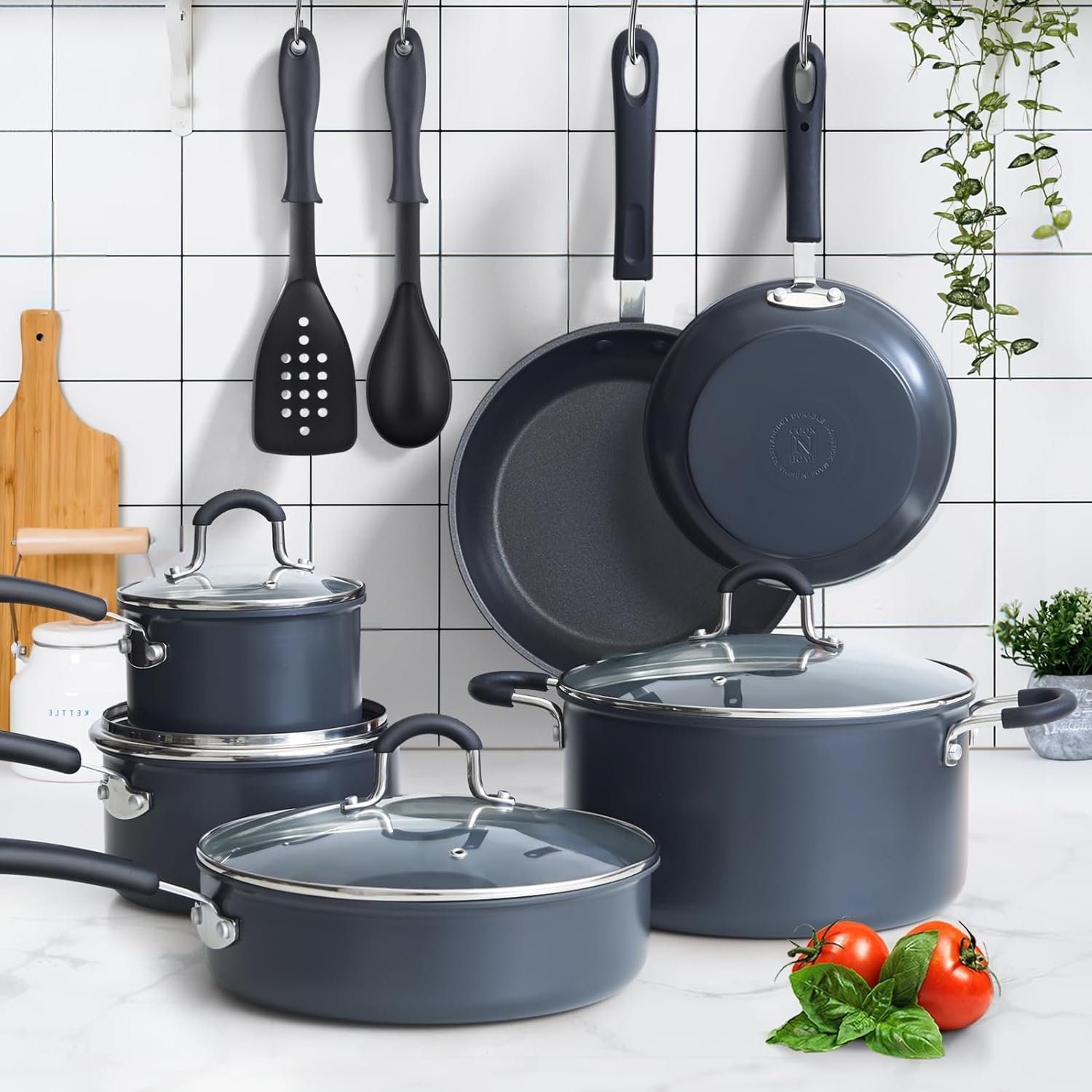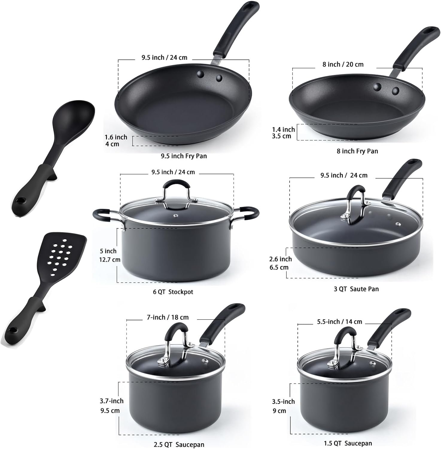 PERFECT PAIR: Professional Hard Anodized Nonstick Pots and Pans 12-Piece Cookware Set includes 1. 5 and 2. 5 quart saucepans with lids, 6 quart stockpot with lid, 3 quart sauté pan with lid, 8 and 9. 5 in frying pans, a nylon spatula and spoon. It matches any kitchen and accommodates all your cooking needs.