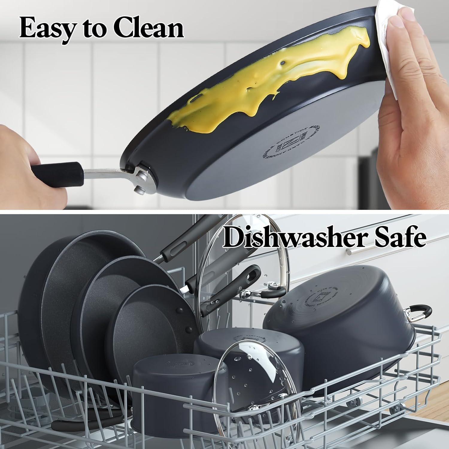 Non-stick hard-anodized aluminum body prevents food from sticking, allows for easy food release and tossing, making cooking and cleaning a breeze. Dishwasher safe, hand wash recommended.
