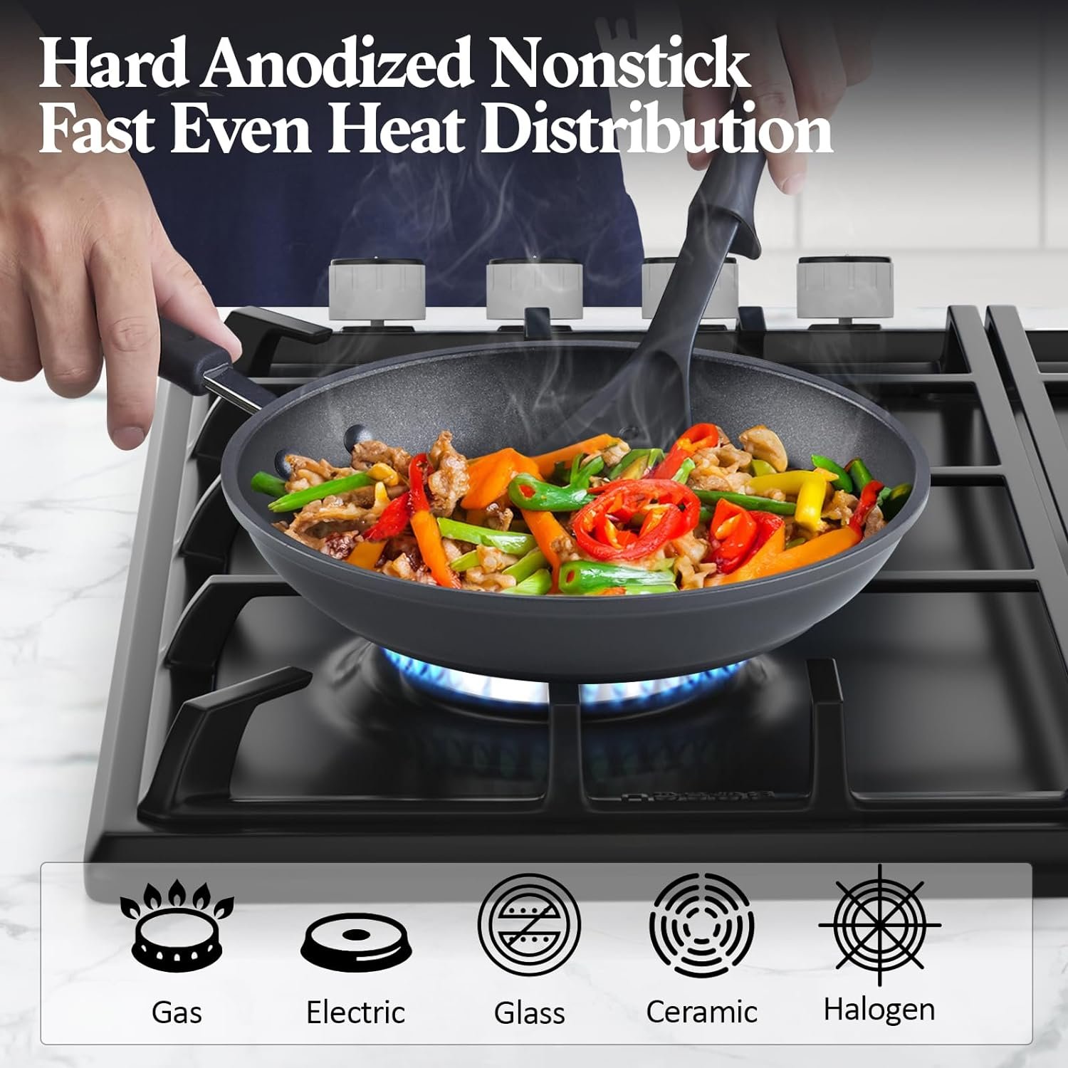 DURABLE and EVEN HEATING: The Hard Anodized aluminum features fast and even heat distribution, Premium material is more durable and corrosion resistant, what’s more it won’t react to acidic food.