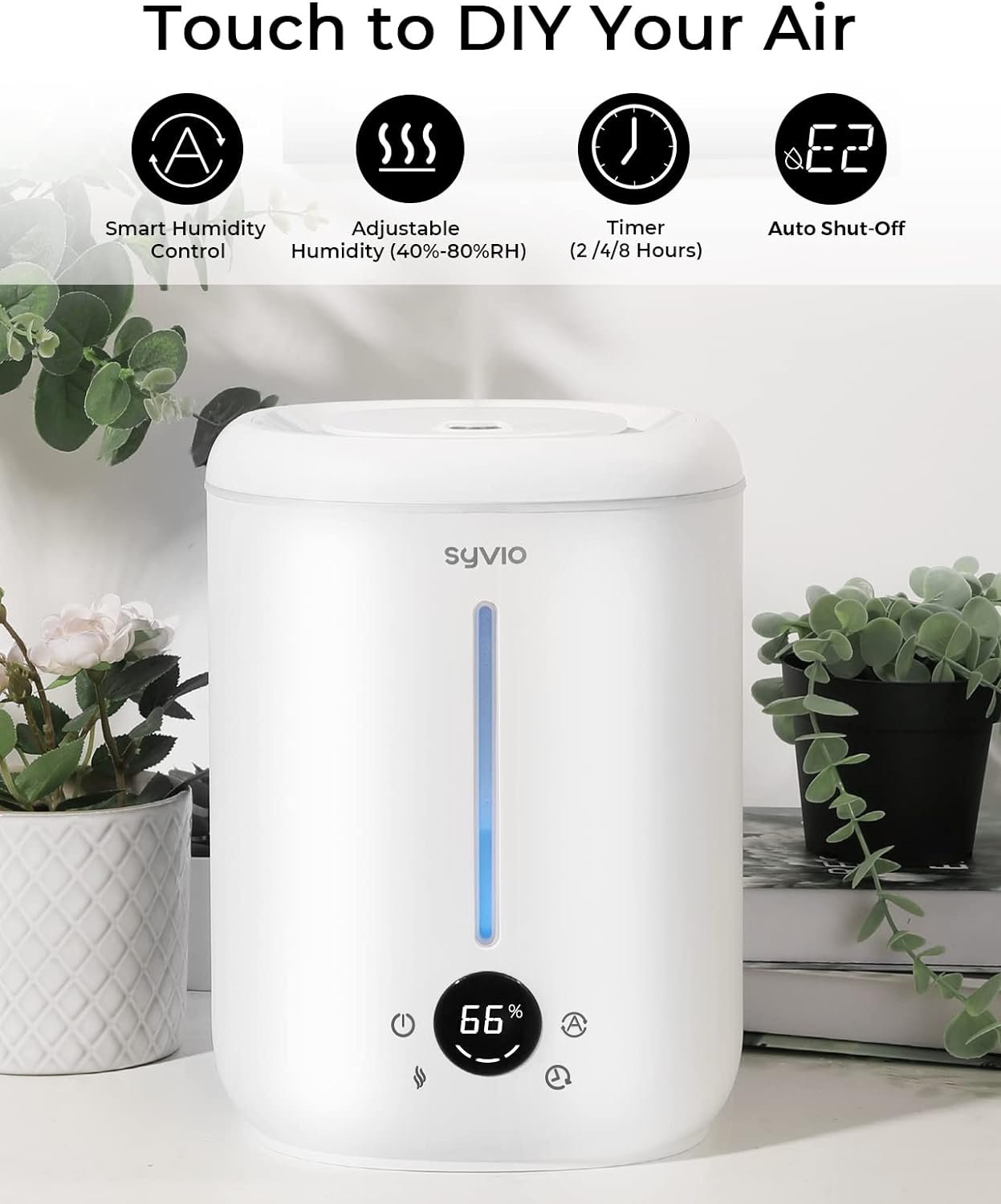 🌟𝗣𝗥𝗘𝗖𝗜𝗦𝗘 𝗛𝗨𝗠𝗜𝗗𝗜𝗧𝗬 𝗦𝗘𝗧𝗧𝗜𝗡𝗚 & 𝟯 𝗖𝗢𝗢𝗟 𝗠𝗜𝗦𝗧 𝗢𝗨𝗧𝗣𝗨𝗧 – Syvio humidifiers for bedroom come with 3 Optional Mist Level(L(100ml/h)/M(200ml/h)/H(300ml/h))for a precise humidity output. With a digital LED Touch Screen, so easy to operate even for children and the elderly, you can customize the ideal humidity from 40%RH to 80%RH. 𝗨𝗹𝘁𝗿𝗮𝘀𝗼𝗻𝗶𝗰 𝗧𝗲𝗰𝗵, below 24dB, keep quiet, ideal for your bedroom, office, baby room, plants nursery, pets room, etc.