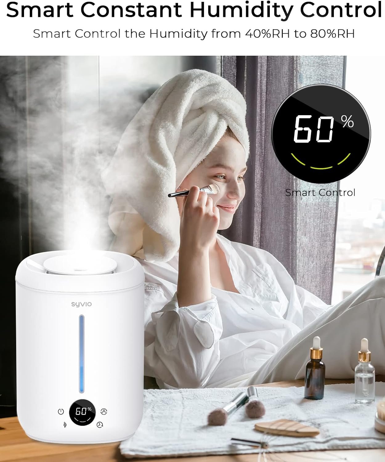 💙𝗦𝗠𝗔𝗥𝗧 𝗔𝗨𝗧𝗢 𝗖𝗢𝗡𝗦𝗧𝗔𝗡𝗧 𝗛𝗨𝗠𝗜𝗗𝗜𝗧𝗬 𝗗𝗘𝗦𝗜𝗚𝗡 – No longer worry about over-humidification! With the built-in smart humidity sensor Tech, Syvio air humidifiers can be auto on and off to achieve fully automatic operation. It will automatically turn off at your target humidity, and it will turn back on automatically when the surrounding humidity is below your target humidity.
