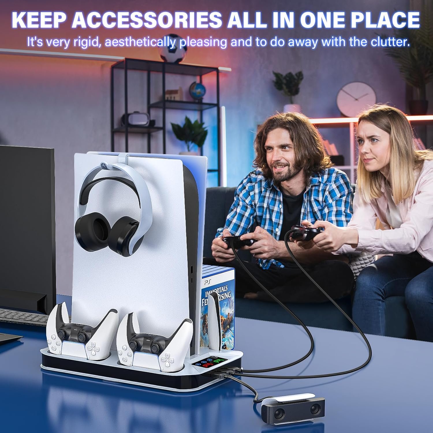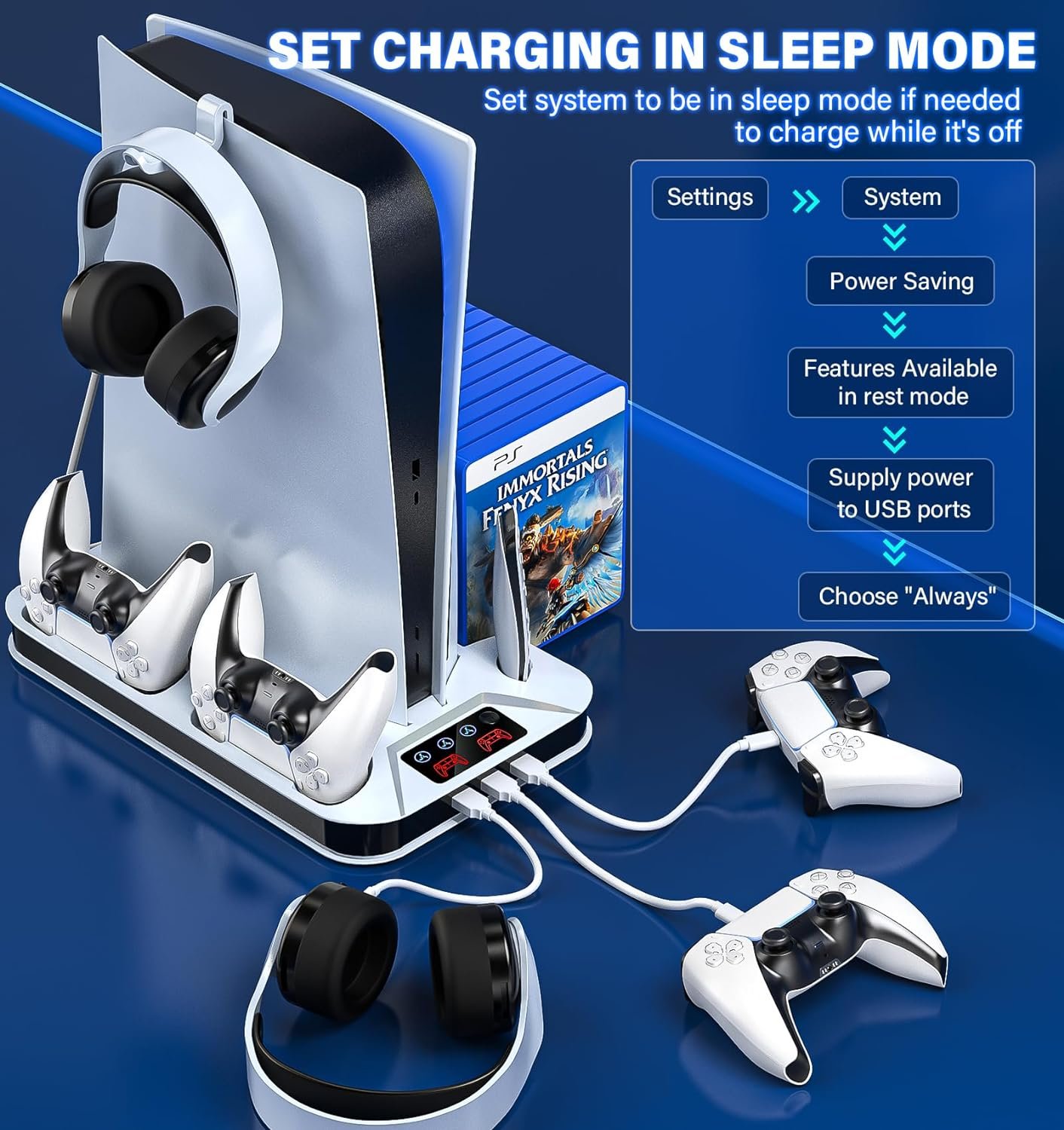 ALL-IN-ONE MULTIFUNCTIONAL BASE STAND FOR PS5: The cooling fan base stand for ps5 has 2 pre-molded charging slots for ps-5 controllers, 13 slots for games, 1 slot for media remote, 1 headset hook for headphone, 3 USB ports and a cooling fan for dissipating heat for ps5 digital edition or disc version console, keeping accessories neat and organized while keeping the play-station 5 setup cool. 1-YEAR quality support. Package List: Stand for PS5 x1; Headset holder x1; USB cable x1.