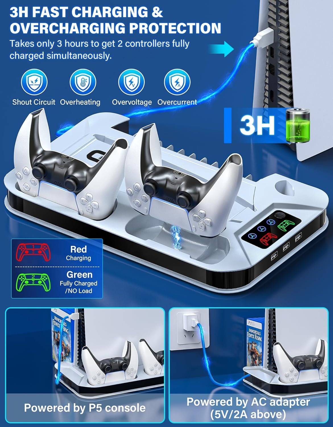 FAST SPEED CONTROLLER CHARGER STATION FOR PS5: Powered by USB port of ps-5 console which offers 5V/2A high current output or 5V/2A adapter, the stand for ps5 with cooling fan and controller charger can fully charge 2 controllers for ps5 within 3 hours simultaneously. The cooling base for ps5 with charging station is equipped with LED indicators to show the fan speeds and the charging status of controller accessories for ps5. RED-Charging; GREEN-Fully Charged. (NOT fit for ps5 edge controller!)