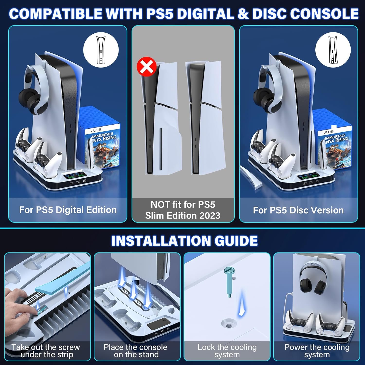COMPATIBLE WITH PS5 DIGITAL EDITION & DISC VERSION CONSOLE: Our aesthetically pleasing vertical stand for ps5 perfectly matches the aesthetic design of play-station 5 console. The cooling station with charger for ps5 has a special fixed auxiliary strip for ps5 digital edition console to match. A screw is placed under the auxiliary strip to avoid losing, keeping the cooler base for ps5 locked in tightly, and 6 anti-slip pads on the bottom ensure cooling system for ps5 more stable and safe.