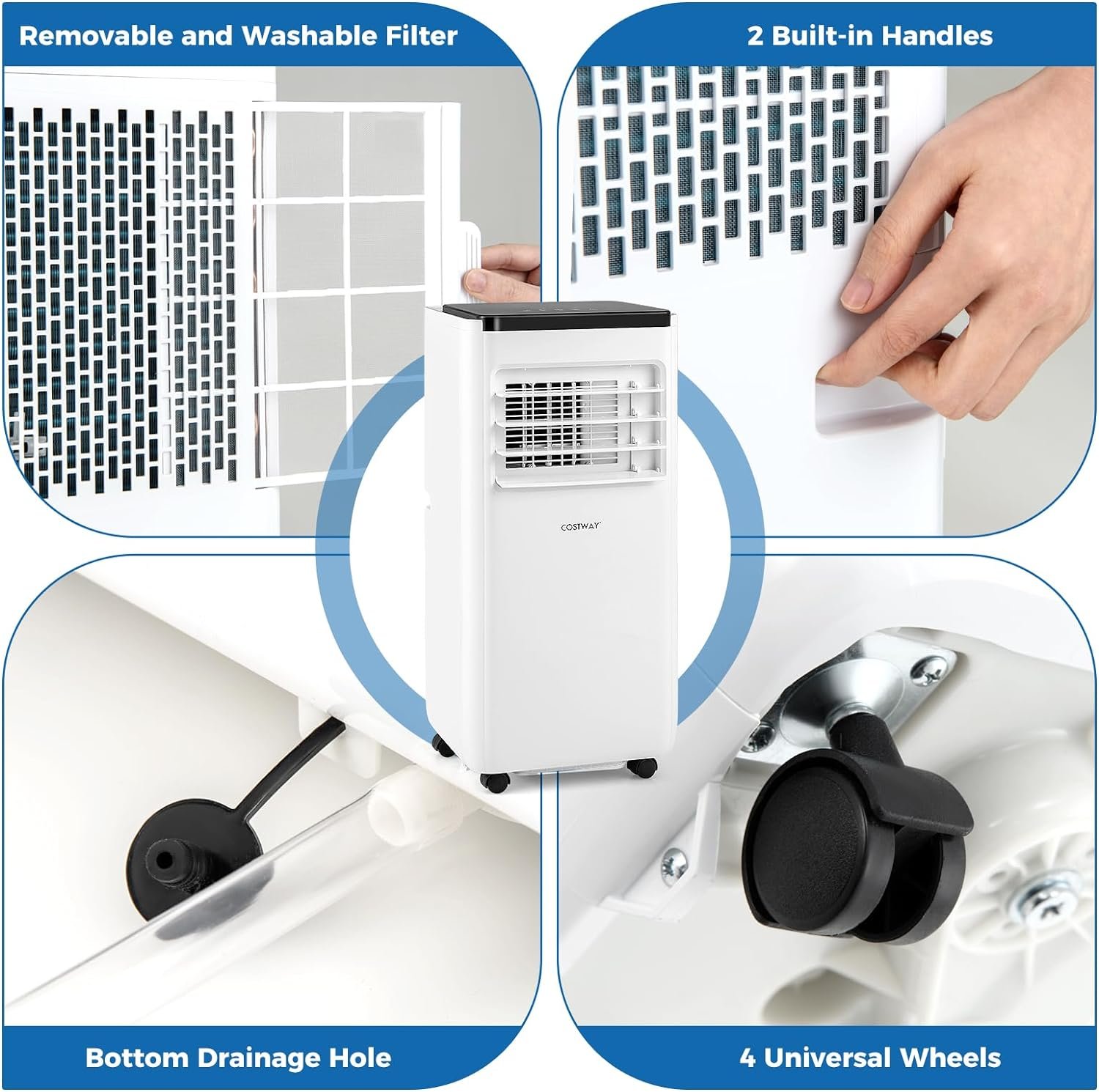 【User-friendly Features:】This floor air conditioner features 2 built-in handles and 4 universal wheels for easy movement. The removable and washable filter makes the cleaning a breeze. The quiet sleep mode won’t bother you while sleeping or working. In addition, you can long press the sleep mode button to activate the child lock.