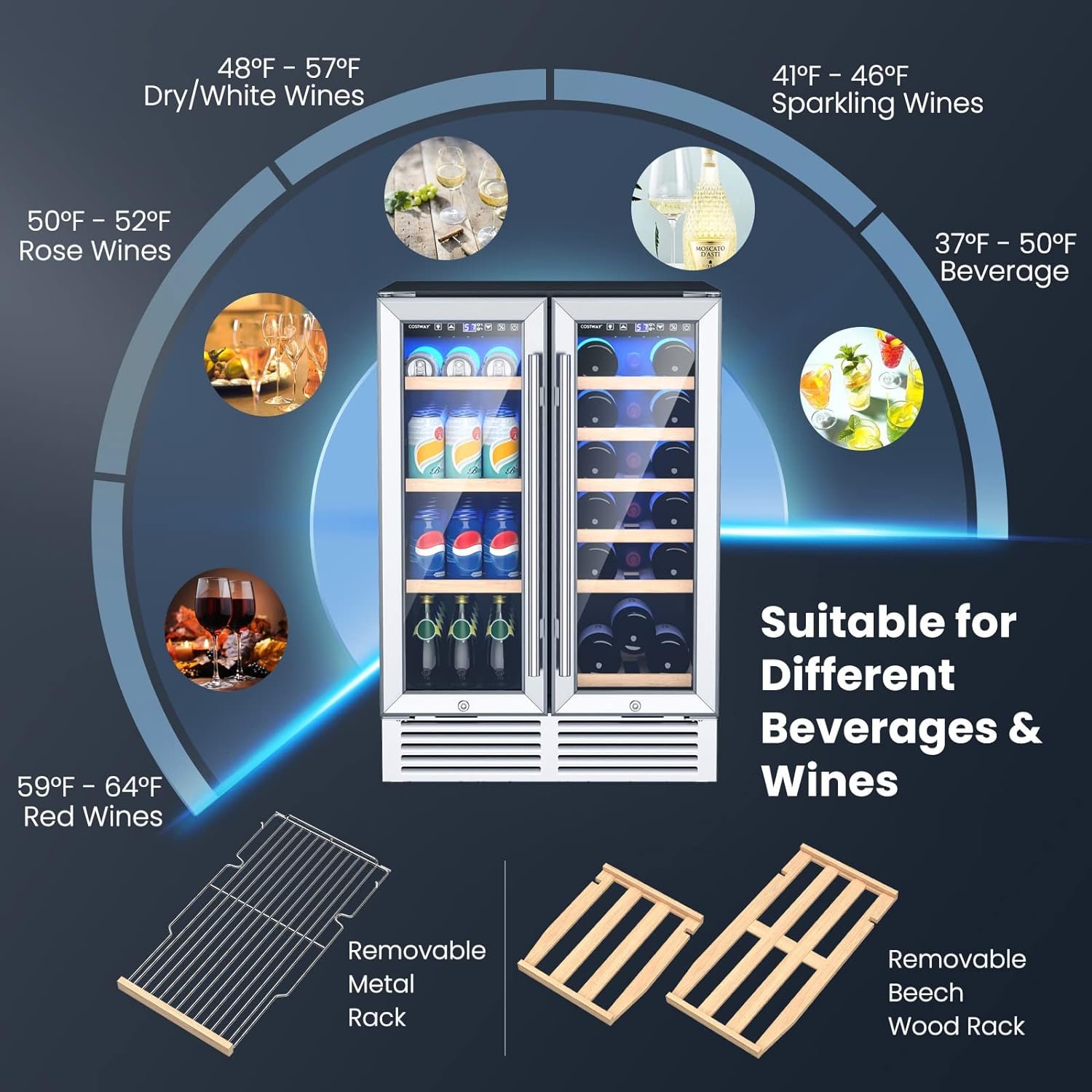 🍷 🍾【Keep Your Drinks Fresh with Dual Zones】Our wine and beverage refrigerator has 2 independent zones that allow you to store your wine and beverage separately. The temperatures in both zones are specially set from 41°F to 64°F for the wine zone and 35°F to 50°F for the beverage zone. You can easily switch the temperature using the user-friendly control panel according to your preference and need.