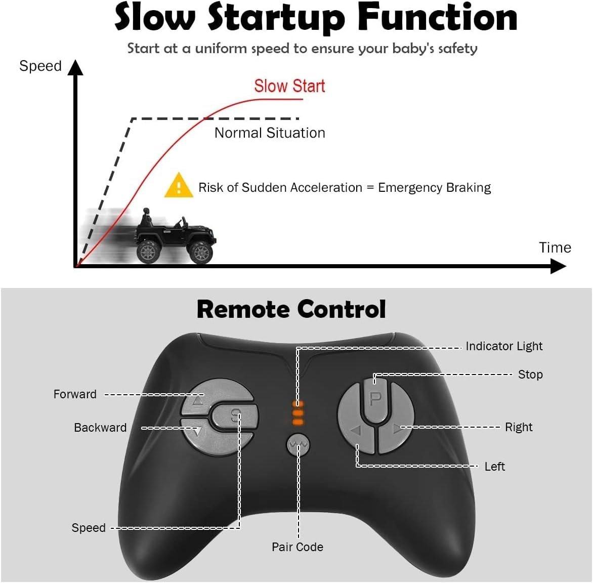 🚙Security Assurance: The kids car is equipped with a slow start function to avoid the risk of sudden acceleration. Besides, 4 wear-resistant wheels is made of superior PP material without leaking or tire burst. Its spring suspension system and seat with multi-point safety belt offer safer driving experience.