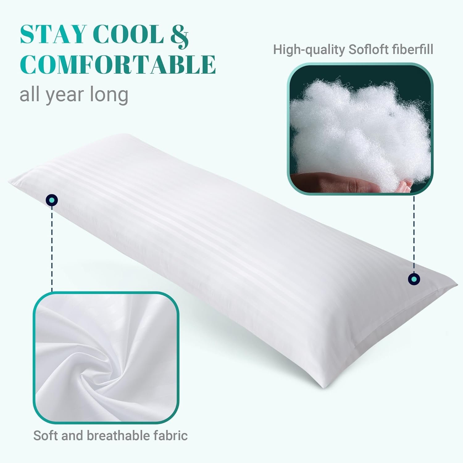 Breathable and Skin-friendly: The surface of Cosybay 20×54 white body pillow insert is made of newly upgraded high-quality polyester fabric, with a unique stripe design that makes the pillow more fashionable and luxurious. It is soft, skin-friendly, and noiseless, allowing you to stay cool and comfortable throughout the night.