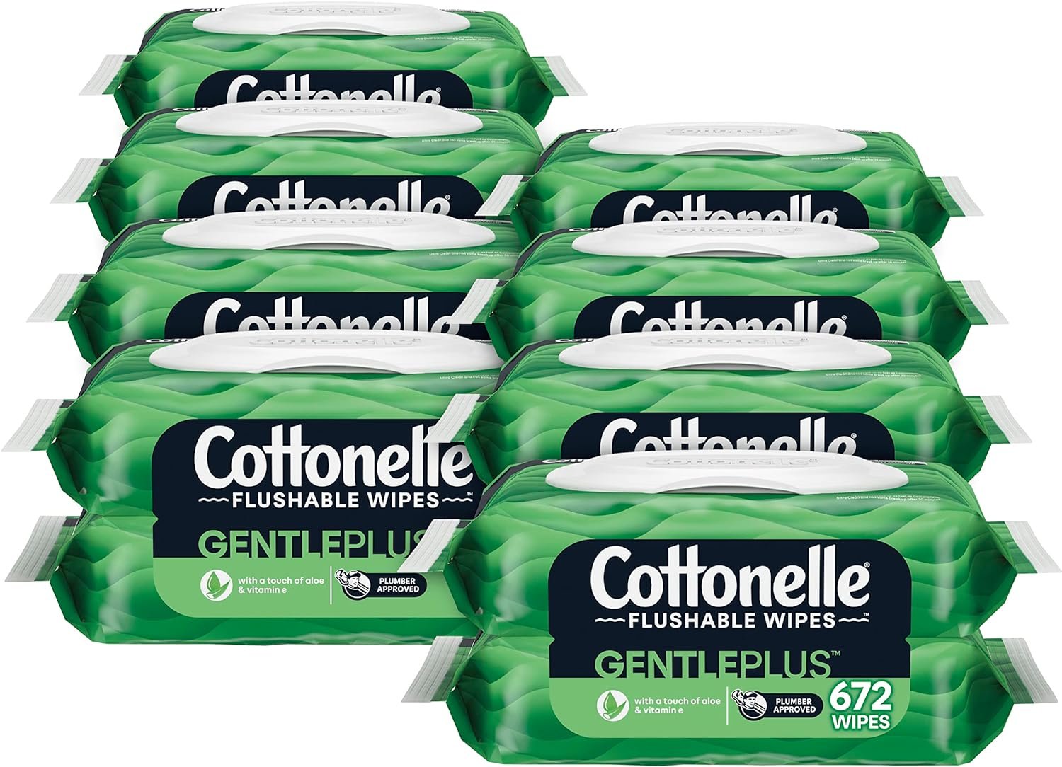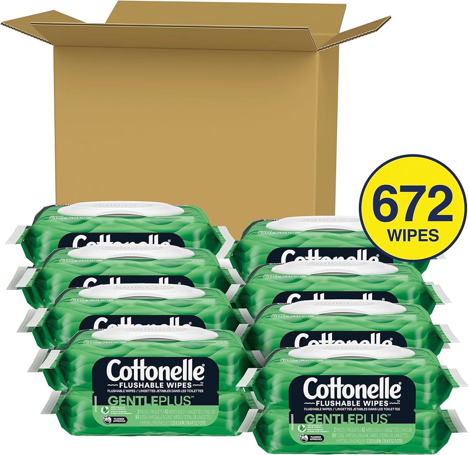16 flip-top pack of Cottonelle GentlePlus Flushable Wet Wipes with Aloe & Vitamin E, 8 packs of 2, 42 flushable wipes per pack (672 wipes total)
