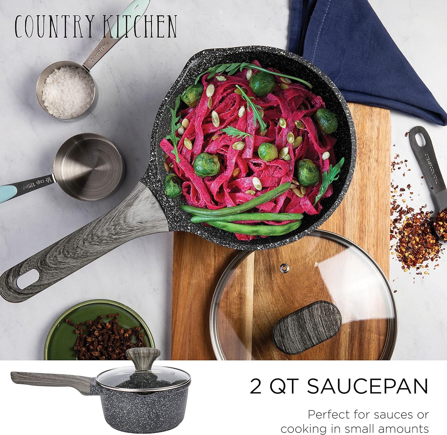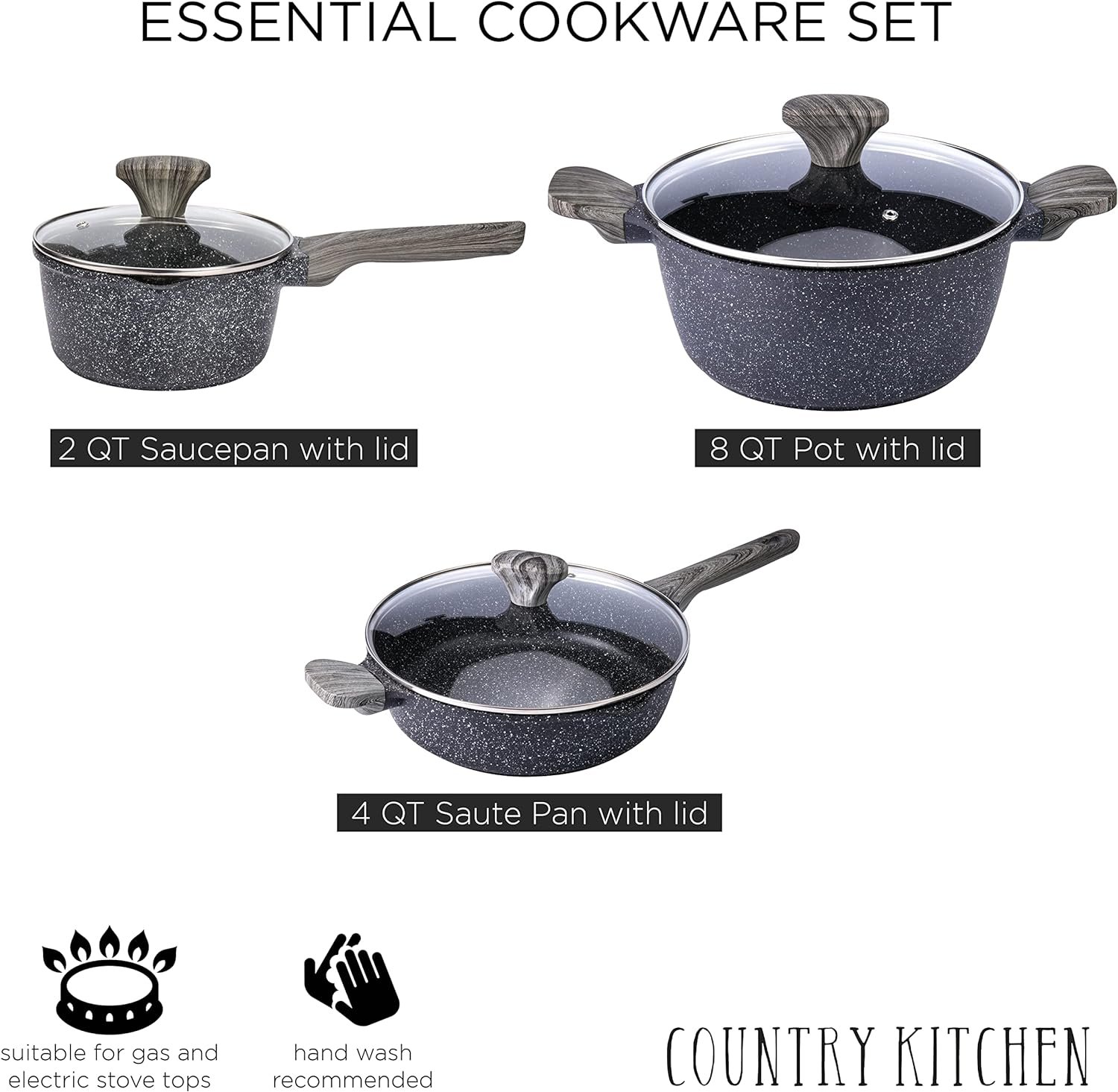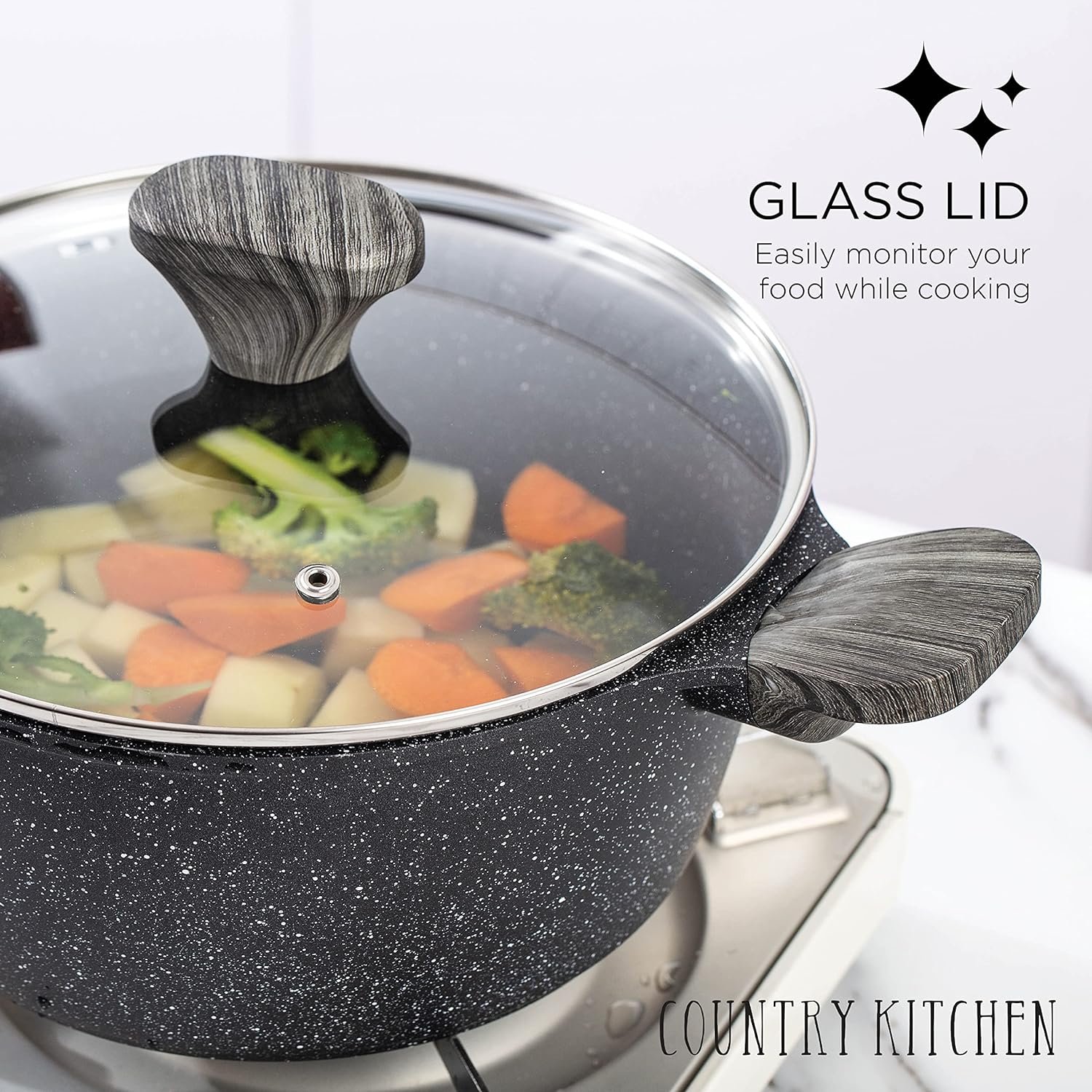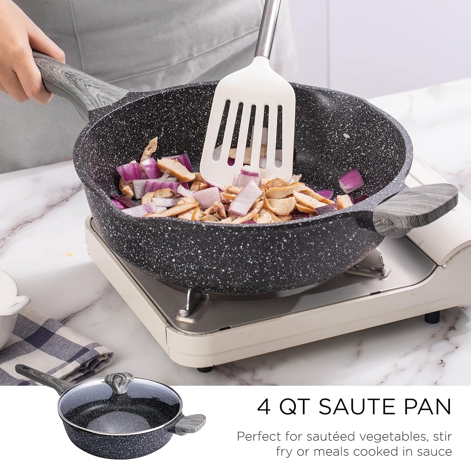 SET INCLUDES – This set includes an 8 qt casserole with glass lid, 11” deep frying pan with glass lid and a 2 qt sauce pan with glass lid. These beautiful cookware sets are designed with a speckled coating and woodlike handle. Not only functional, but these sauté pans are decorative as well.