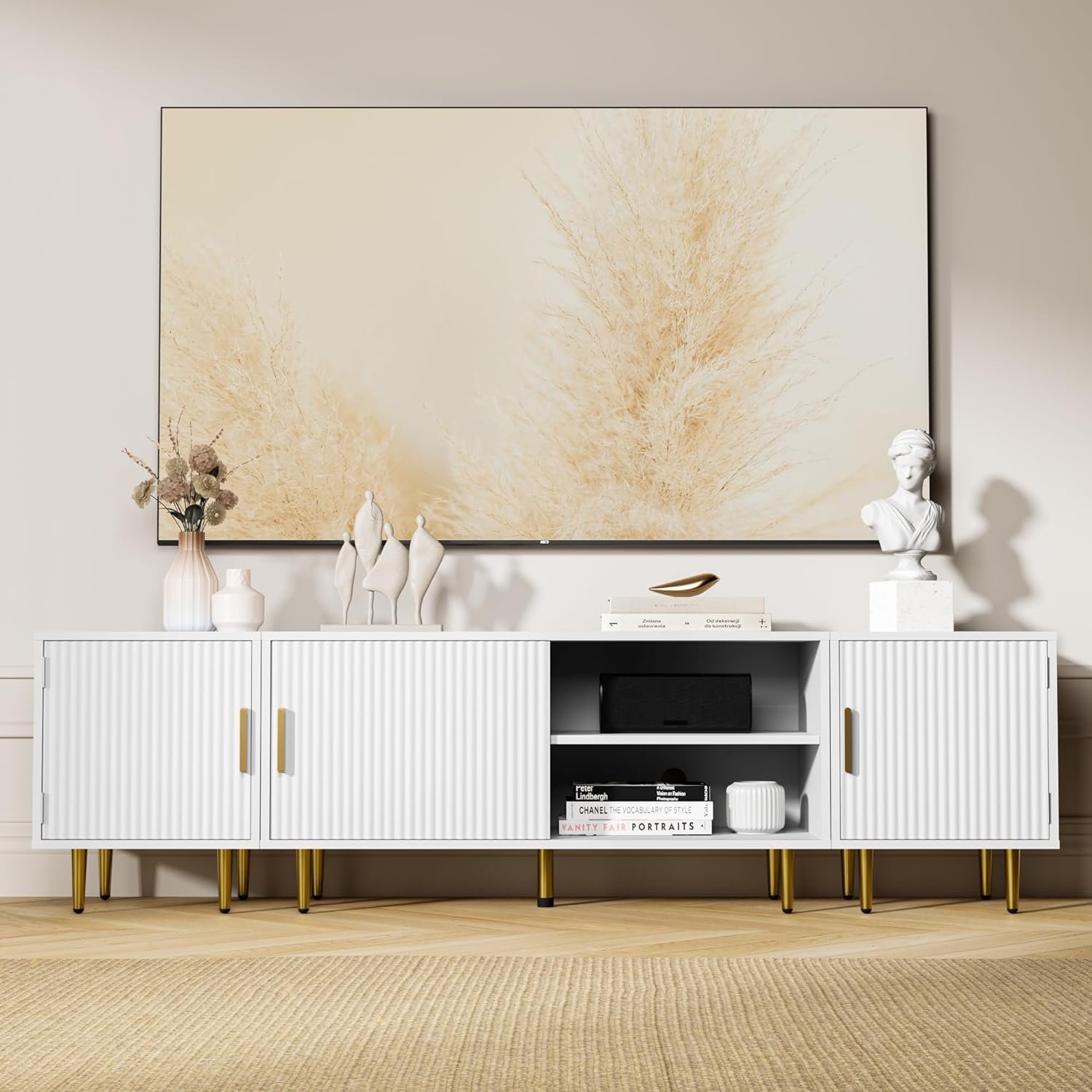 This TV console comes with 2 storage cabinets with doors and 2 open space with a sliding door, providing large and flexible storage capacity space. The two small cabinets on the left and right are movable, so you can use it as a sofa side table or nightstand to accent the room.