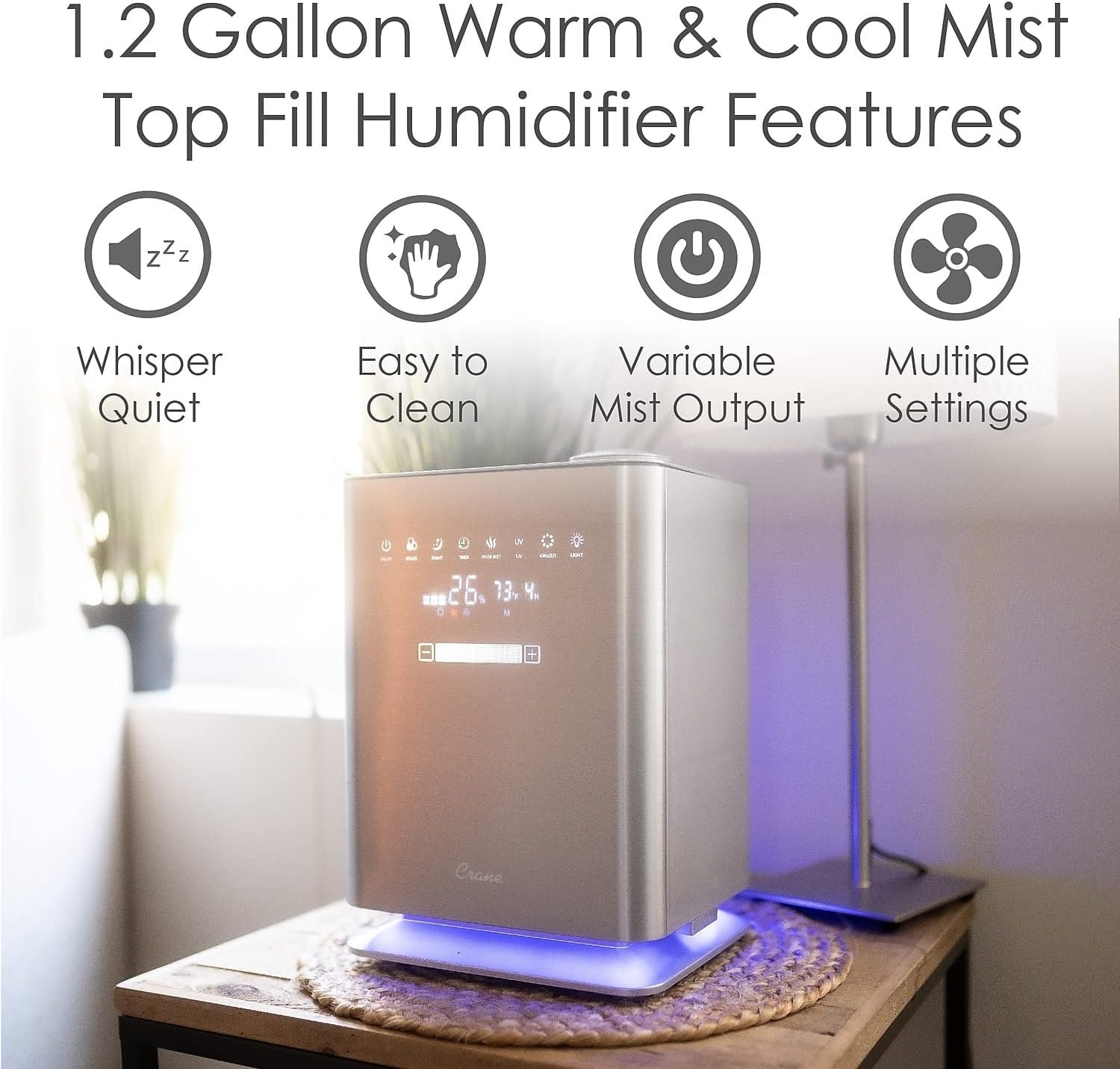 LARGE ROOM HUMIDIFIER: Crane Ultrasonic Humidifier features an easy-to-clean, detachable bottom fill tank that holds 1.2 gallons of water− perfect for humidifying indoor spaces up to 500 square feet for 24 hours