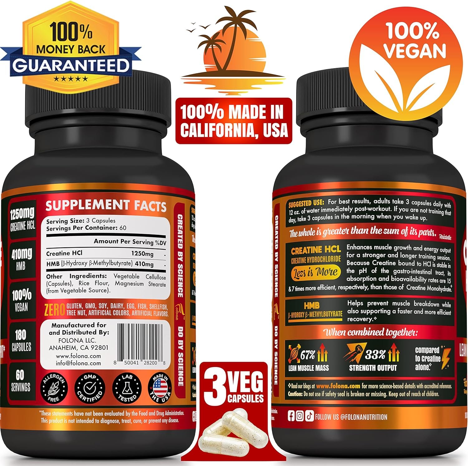 LESS IS MORE: Because Creatine HCl has permeability in the digestive tract (i.e. absorbability by the body) 15 times greater than Monohydrate, only 1-2g of Creatine HCl is needed for the same effect of 5 grams of Monohydrate. No more loading phase, no more dreading to gulp down 6+ large pills of Monohydrate. Take 3 capsules of Folona Creatine HMB with 8-12 oz of water daily and see your body transform in less than two weeks!