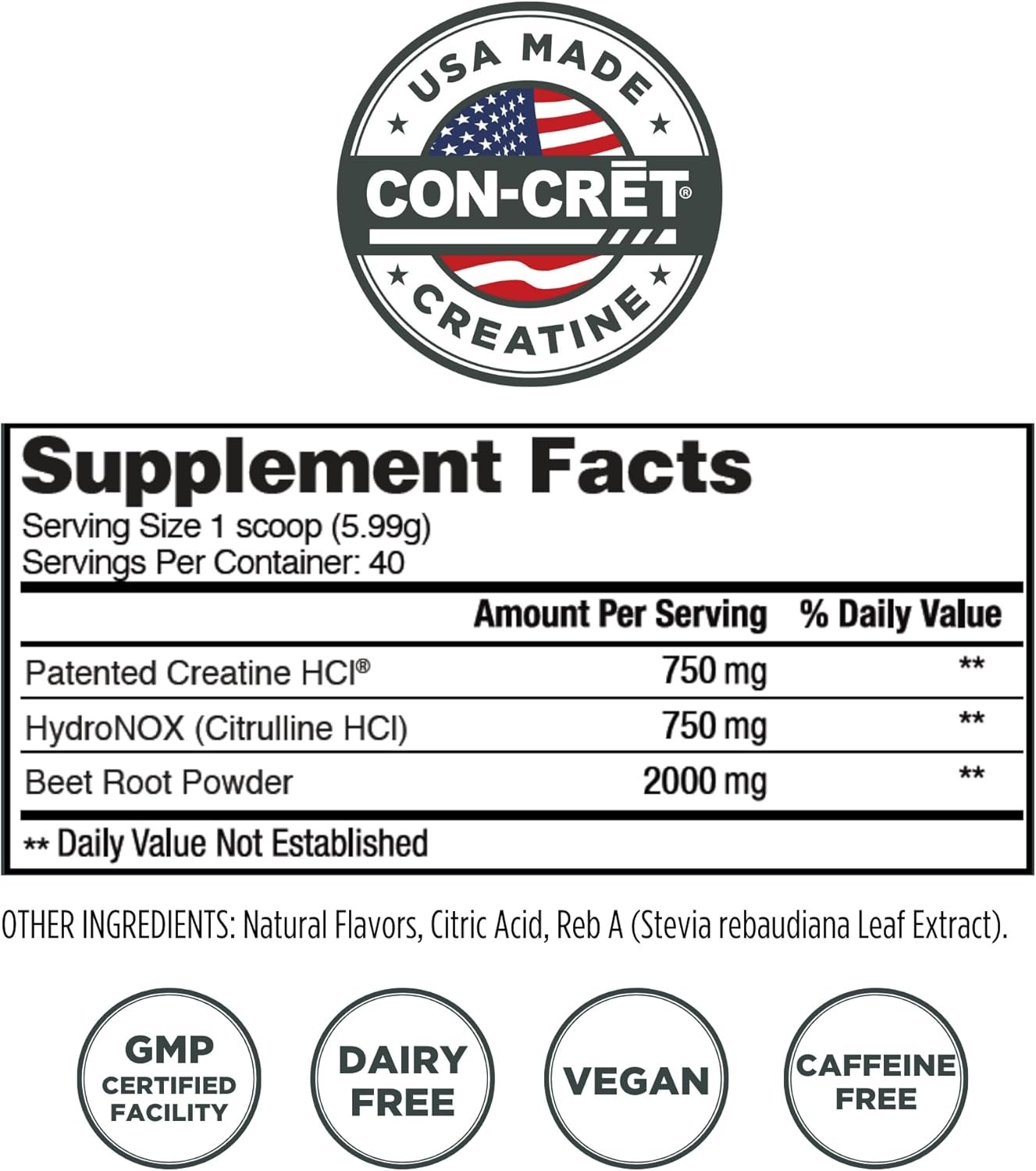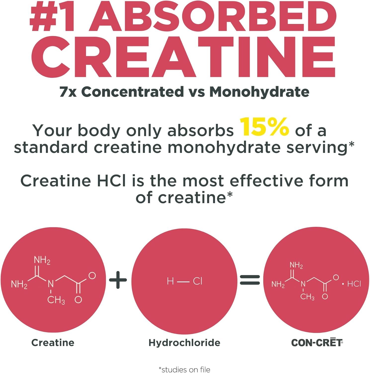Clean and Effective Creatine HCl*: CON-CRET Creatine provides functional energy to power all cells in your body without any unwanted side effects like bloating, stomach irritation, or cramping. 3-in-1 supplement in a superior, easy-to-absorb formula containing Creatine HCl, Citrulline HCl, and Naturally Flavored Beet Root Powder.