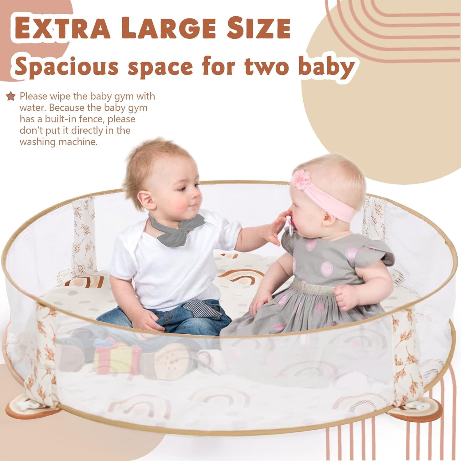 SAFETY & SECURE DESIGN: Crafted from baby-safe materials and featuring a non-slip bottom, our baby play mat prioritizes your child’s well-being. The padded mat offers a cozy and secure area for tummy time and play. For cleaning, a simple wipe with water is recommended. Please note, due to the built-in fence, avoid placing the baby gym directly in the washing machine.