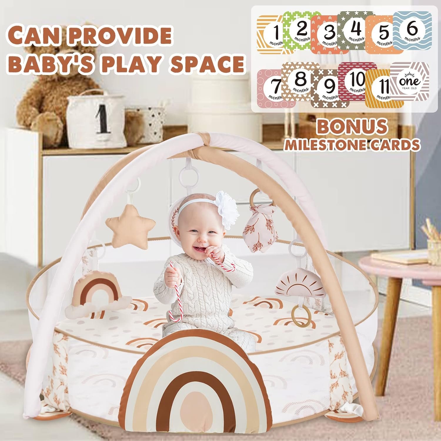 5 HANGING TOYS & PILLOW & MILESTONE CARDS: Unveil a world of delights with our baby gym. It offers 5 sensory hanging toys that stimulate exploration and a moon pillow, a rainbow bag for cozy comfort. Plus, enjoy 12 colorful milestone cards, capturing every precious month of your baby’s first year.