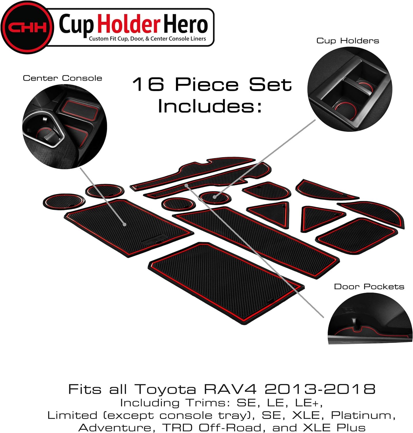✅YOUR INTERIOR IS COVERED – Floor mats, cup coasters, and seat covers aren’t enough to protect against all the gunk attracted in automotive drink holders and center console areas. Your new 16 piece non slip mat set protects your console, door pockets, and cup holders and keeps your vehicle looking fly. (Fits all 2013, 2014, 2015, 2016, 2017, and 2018 Toyota RAV4 models including trim levels: SE, LE, LE+, Limited (except console tray), SE, XLE, Platinum, Adventure, TRD Off-Road, and XLE Plus)