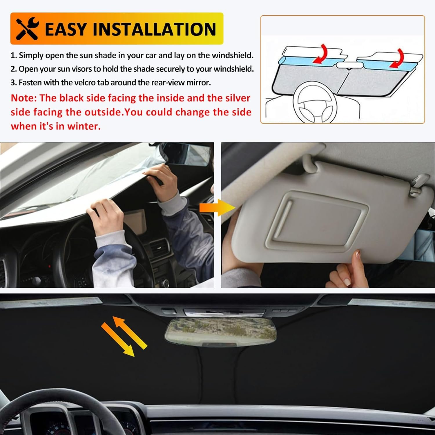 Easy Installation: No tools and no modifications needed. Effectively reduce the temperature in the car on summer and can help the interior accesseries out of the high temperature. Very easy to install and store. Just open and unfold. It can be packed and store at the car due to the strong resilience, tiny size and foldability. Because of the elastic steel, you don’t need to worry about the deformation problem.