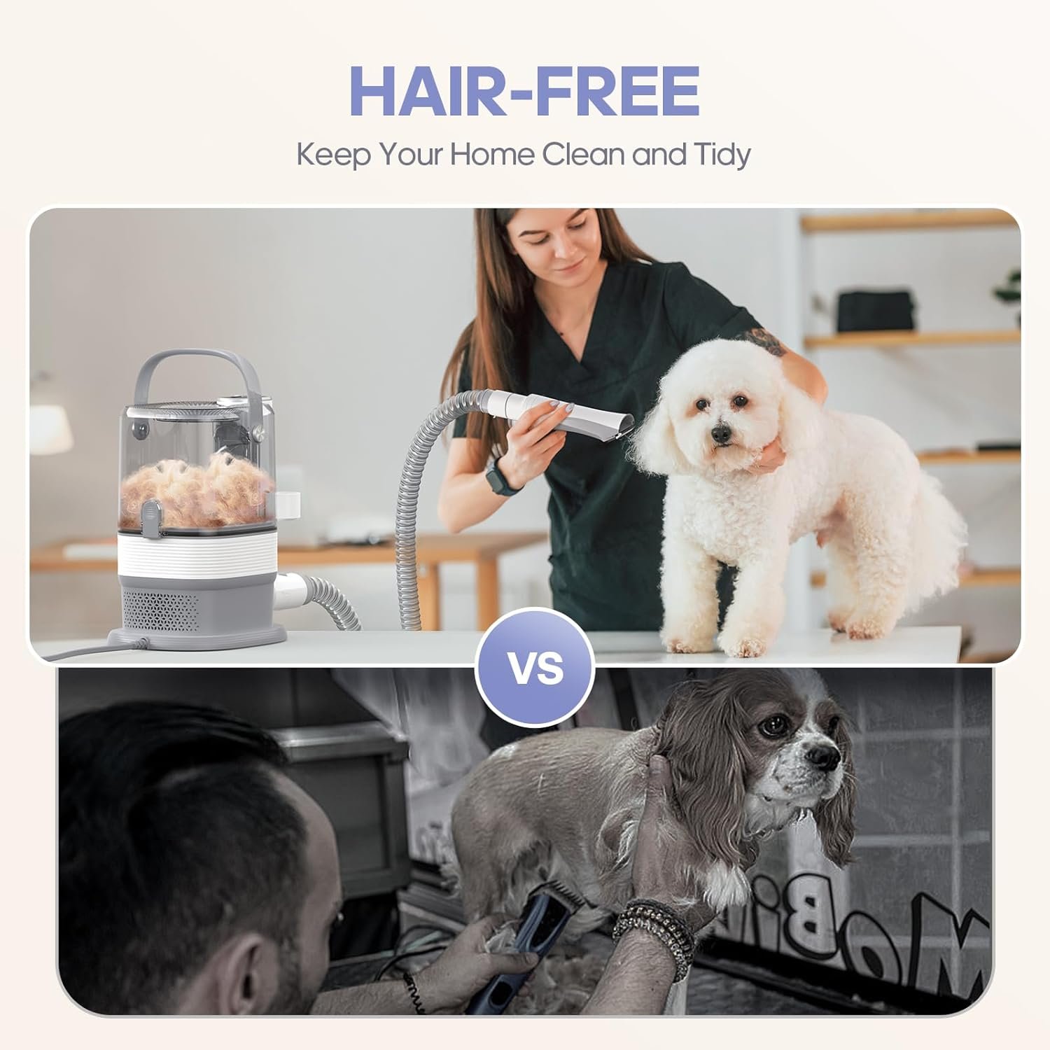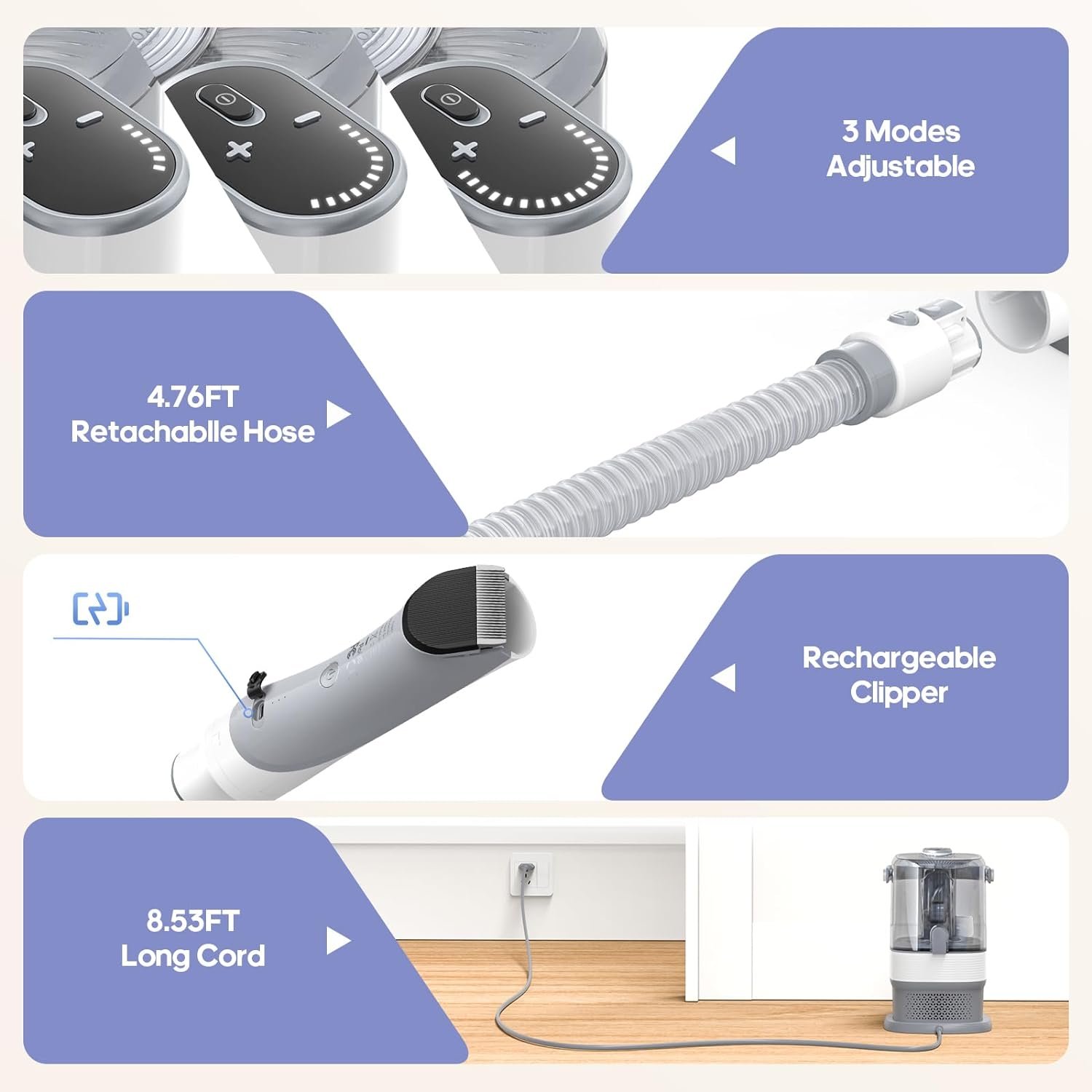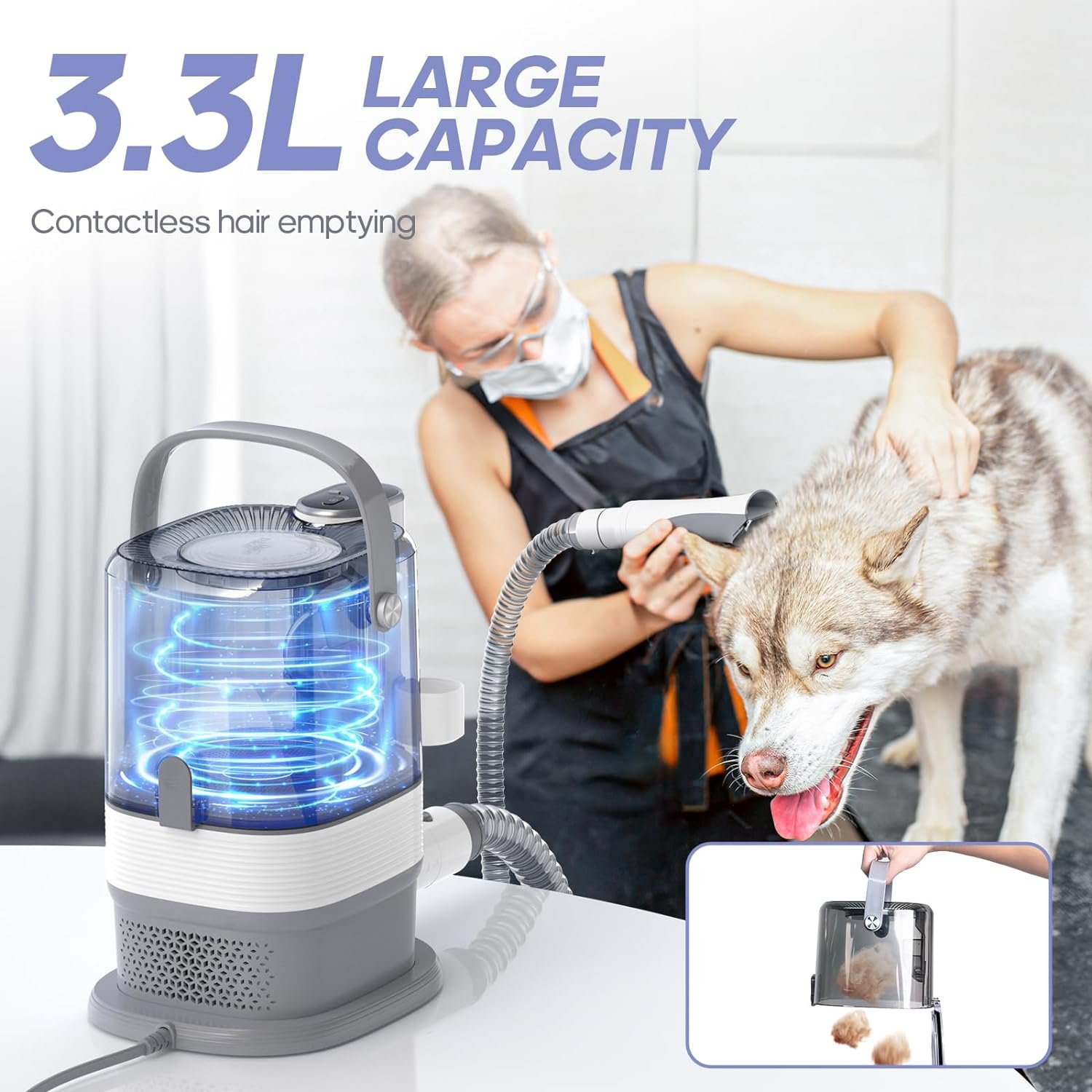 【3.3L Super Large Dust Cut】 Our upgraded pet grooming vacuum for dogs features a 3.3 L detachable dust cup, the largest dust cup on the market. Collect more pet hair without the need for frequent emptying. Reduce cleaning frequency and save time!