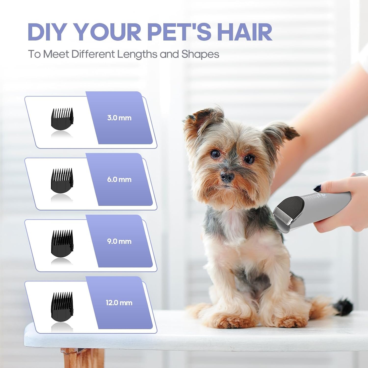 【4 Comfortable Guard Combs】 The pet grooming vacuum comes with 4 adjustable combs (3 mm/6 mm/ 9 mm/12 mm), Suitable for shaving pet hair of different lengths. The removable blade and guide comb are easy to replace and clean and are safe and hygienic for pet grooming.