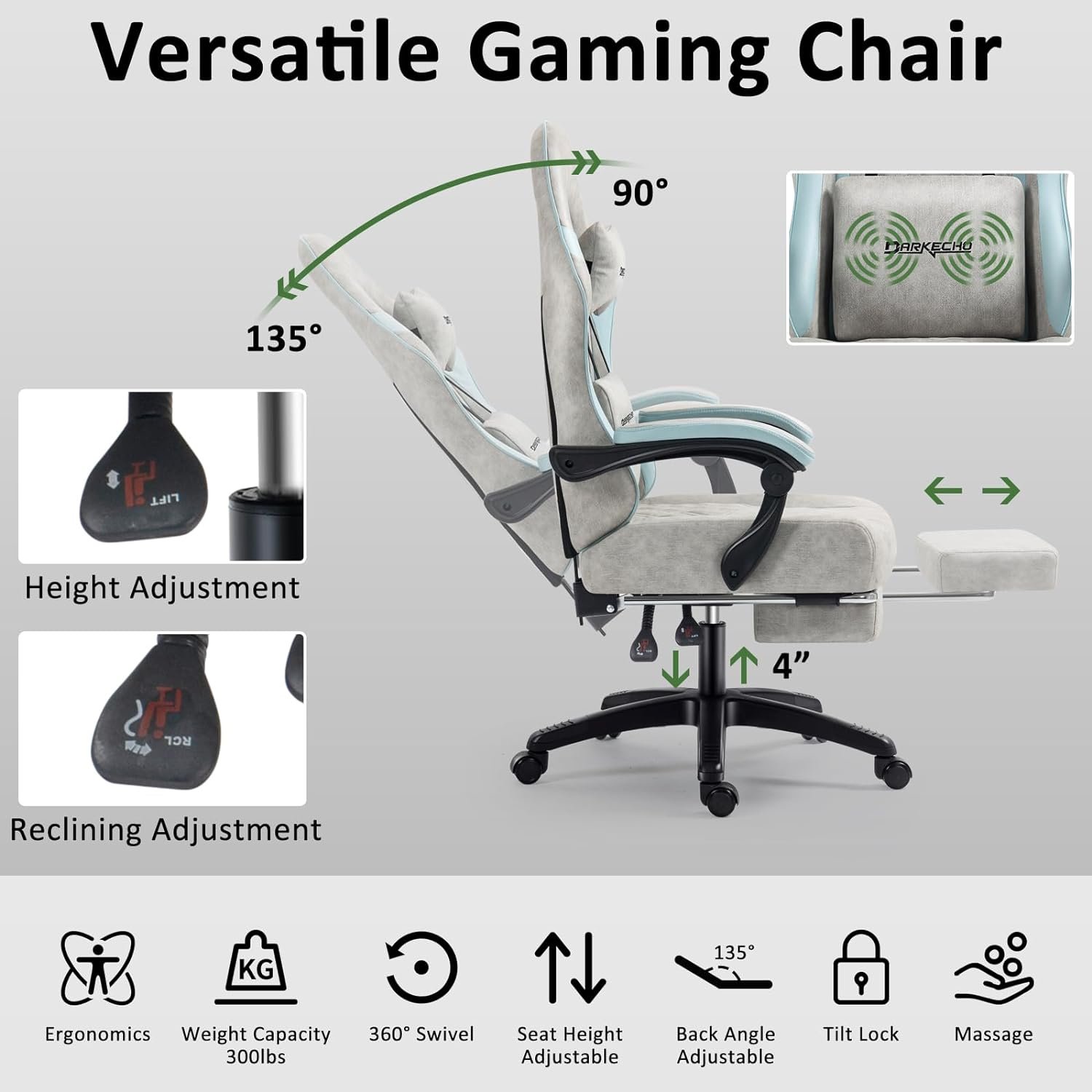 【Unmatched comfort and relaxing】Revel in unrestricted relaxing and exceptional comfort with our wide seat gaming office chair.The USB powered lumbar pillow has massage function,effectively reduce fatigue.The chair back 90 ° to 135 ° reclining is great for relaxing.The padded linkage armrests relax your elbows.The headrest pillow and lumbar support pillow give ergonomic comfort and support to your lower back,ensuring your comfortable and correct posture in the gaming and working.