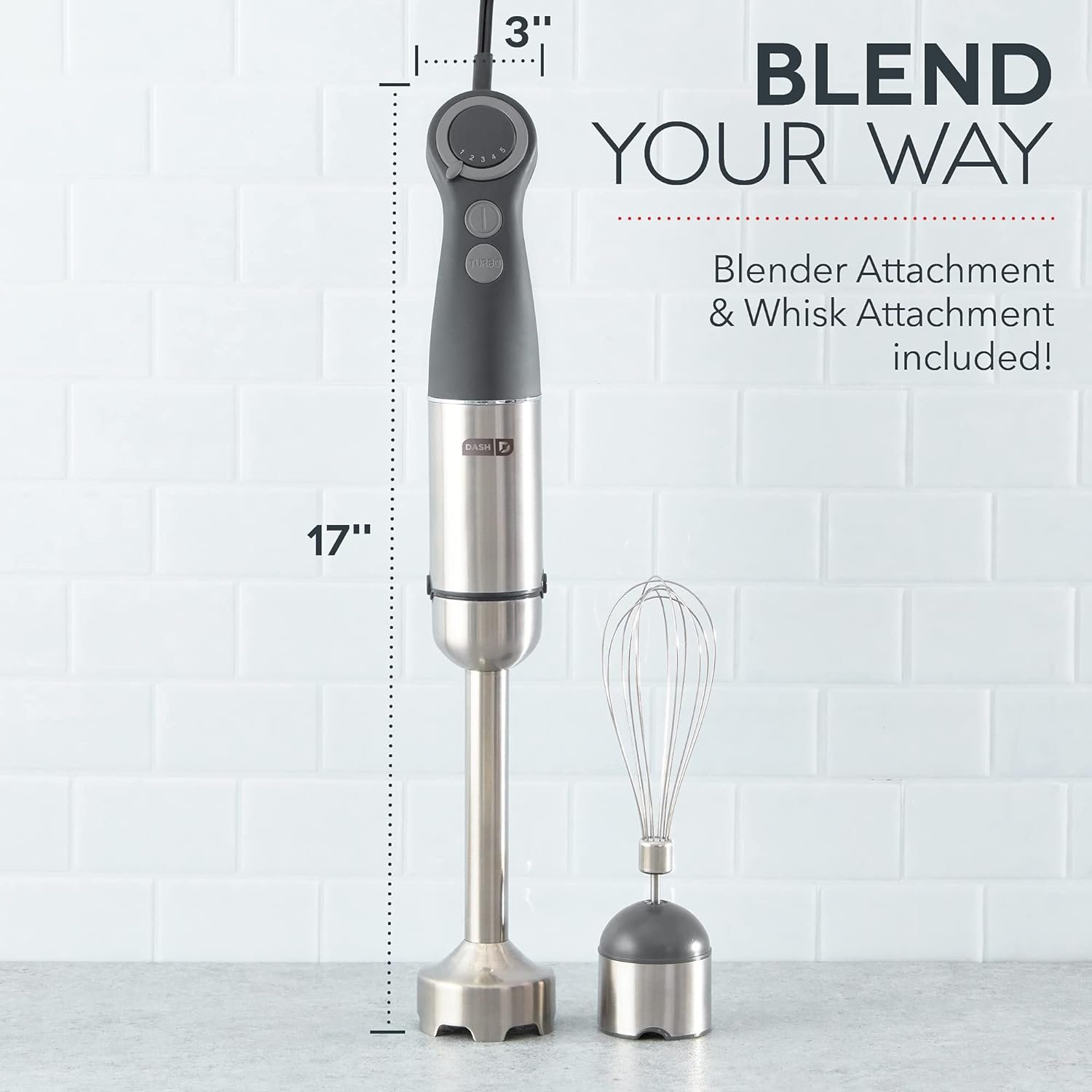 Dash Chef Series Immersion Hand Blender, 5 Speed Stick Blender with Stainless Steel Blades, Whisk Attachment and Recipe Guide – Cool Grey