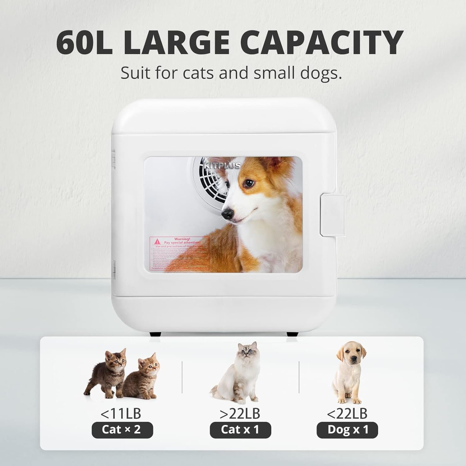 😸60L Large Capacity: Our pet dryer can accommodate 2 cats weighing less than 11 lbs each or 1 dog weighing less than 22 lbs. The large room helps to reduce pet anxiety and fear. Features an innovative curved surface design to protect pets and parents from injury.