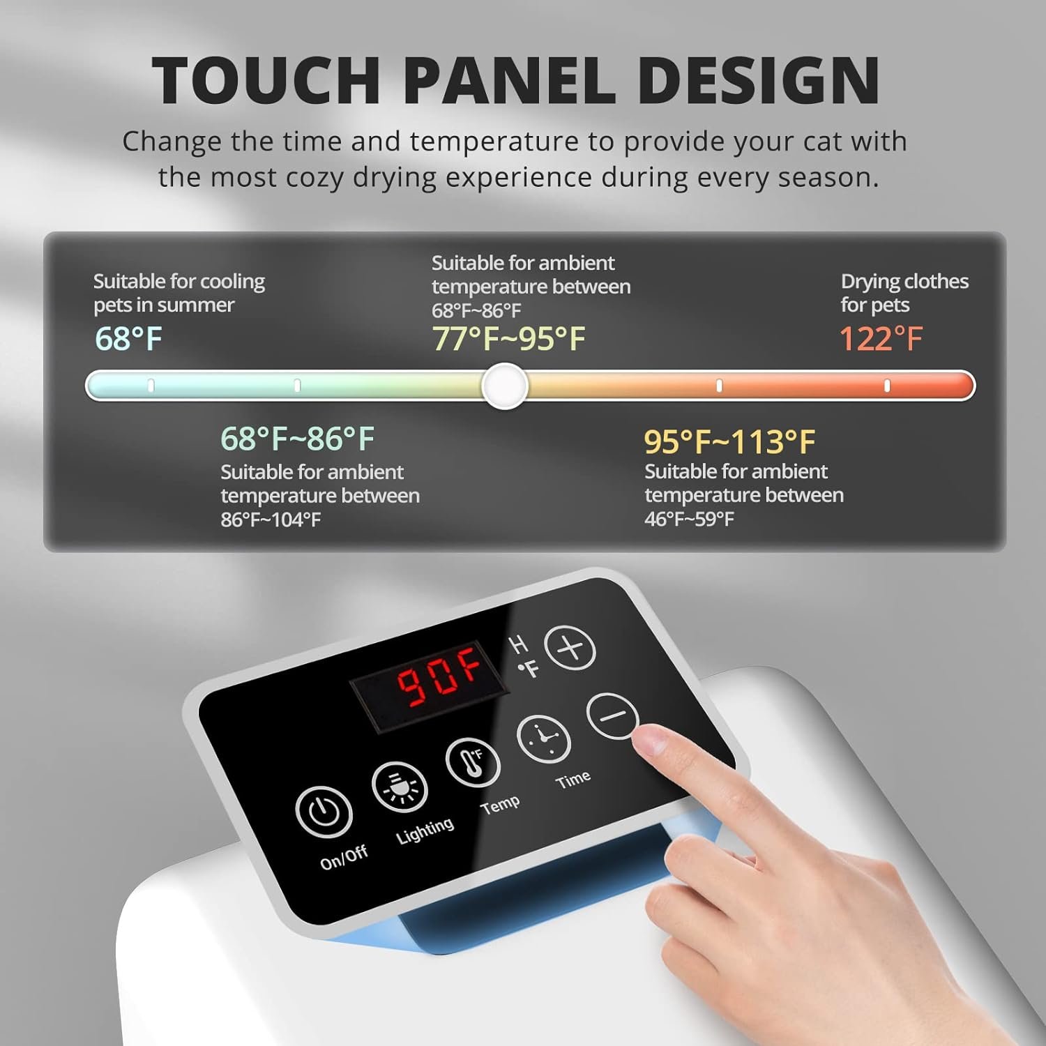 😸Intelligent Control Panel: Touch to customize the temperature and drying time. We offer recommended cabin temperatures to suit various external temperatures to maximise comfort. The 3W light can be turned on for night use. Making it convenient to dry your pet throughout the year and from morning to night.