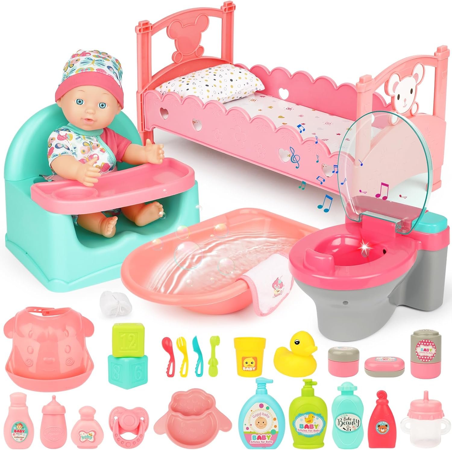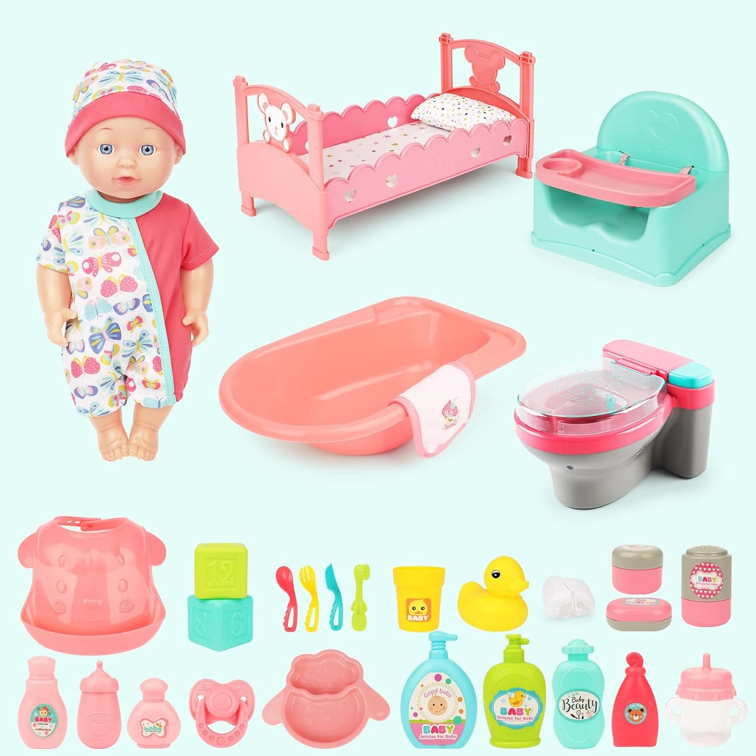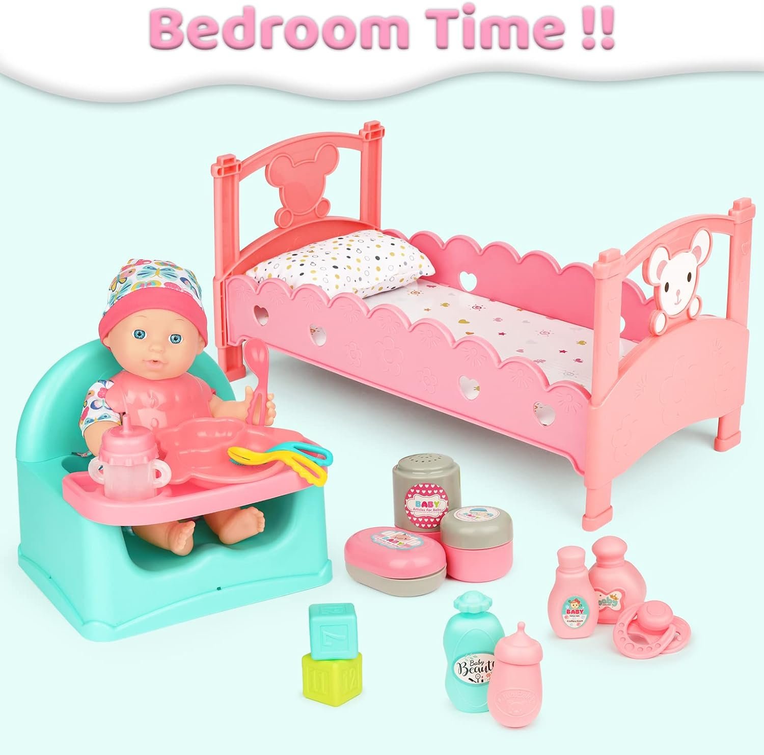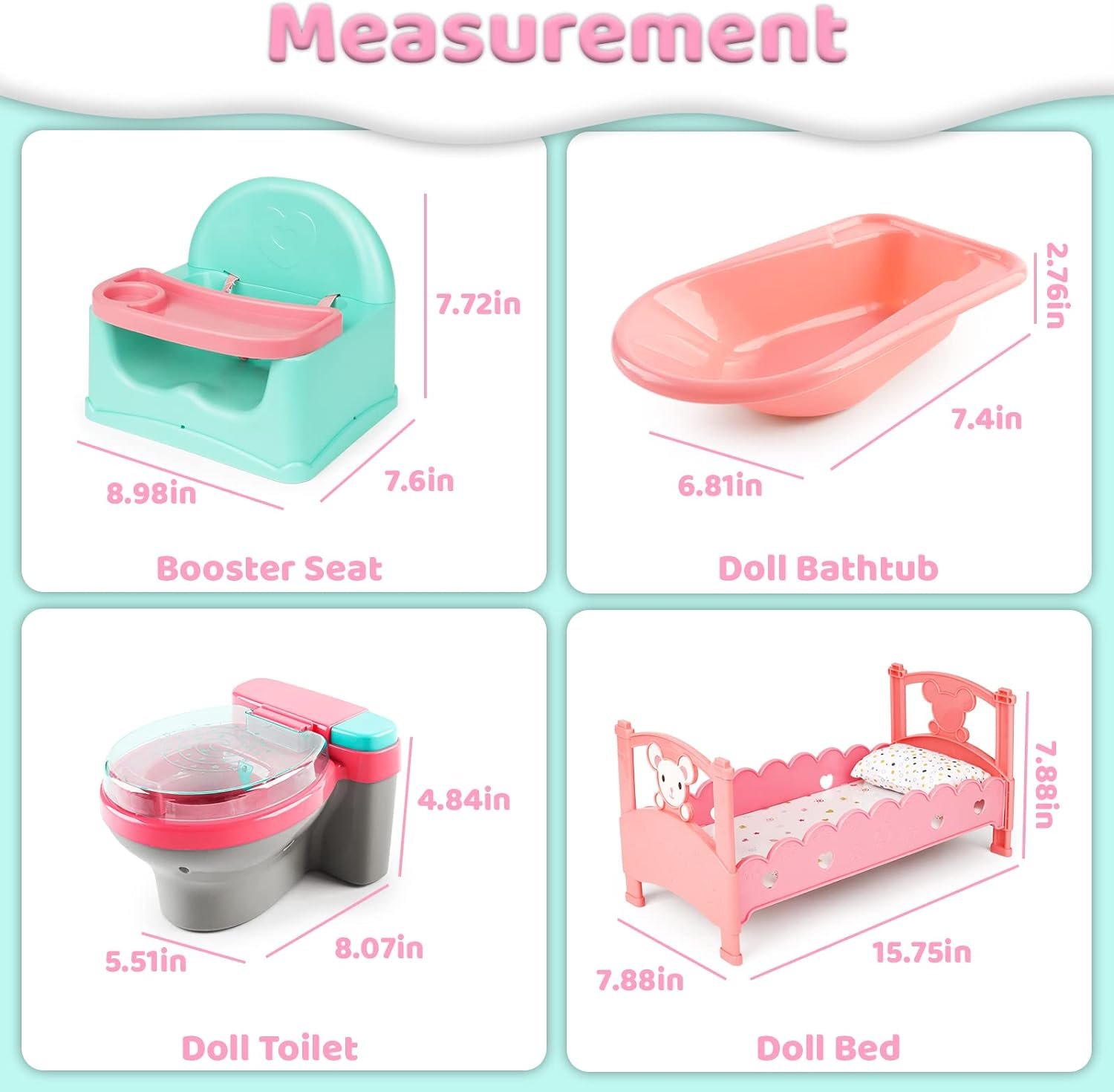 【deAO Baby Doll Set】My First Baby Doll Play Set!This set includes baby doll, cot bed,bath, toilet toy,highchair toy,cutlery toy, baby bottle toy, duck toy,and other baby doll accessories.