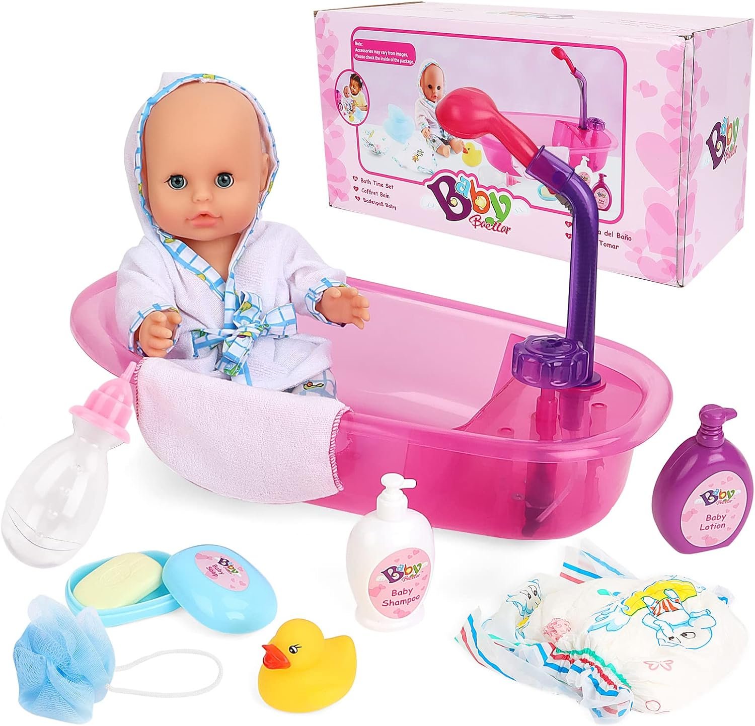 【BATH TIME FUN】Great bath baby doll playset that your little one will love! A variety of accessories, a 13” baby doll and bath tub included – everything your child will need is in this one play set.