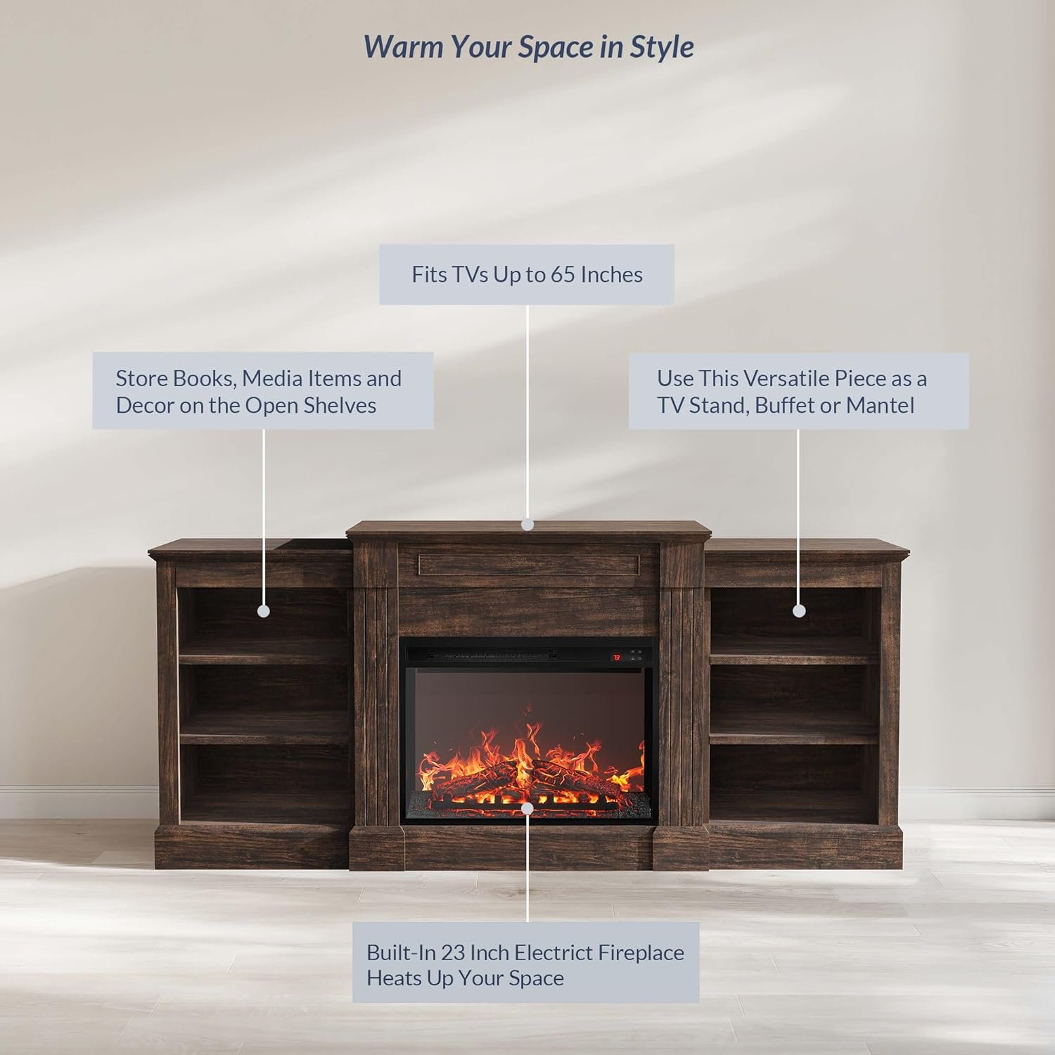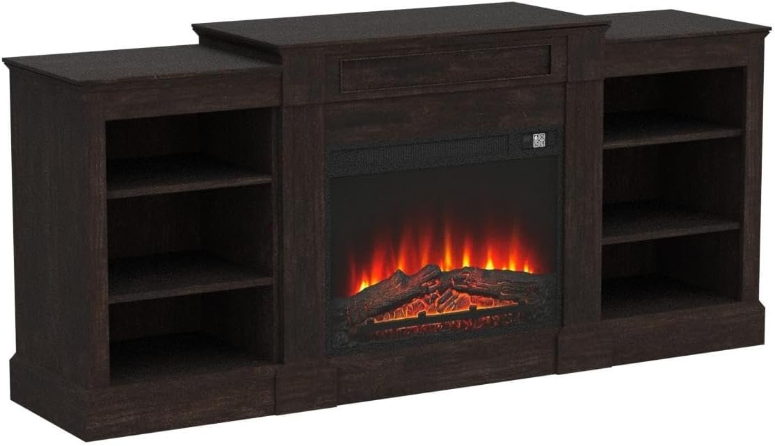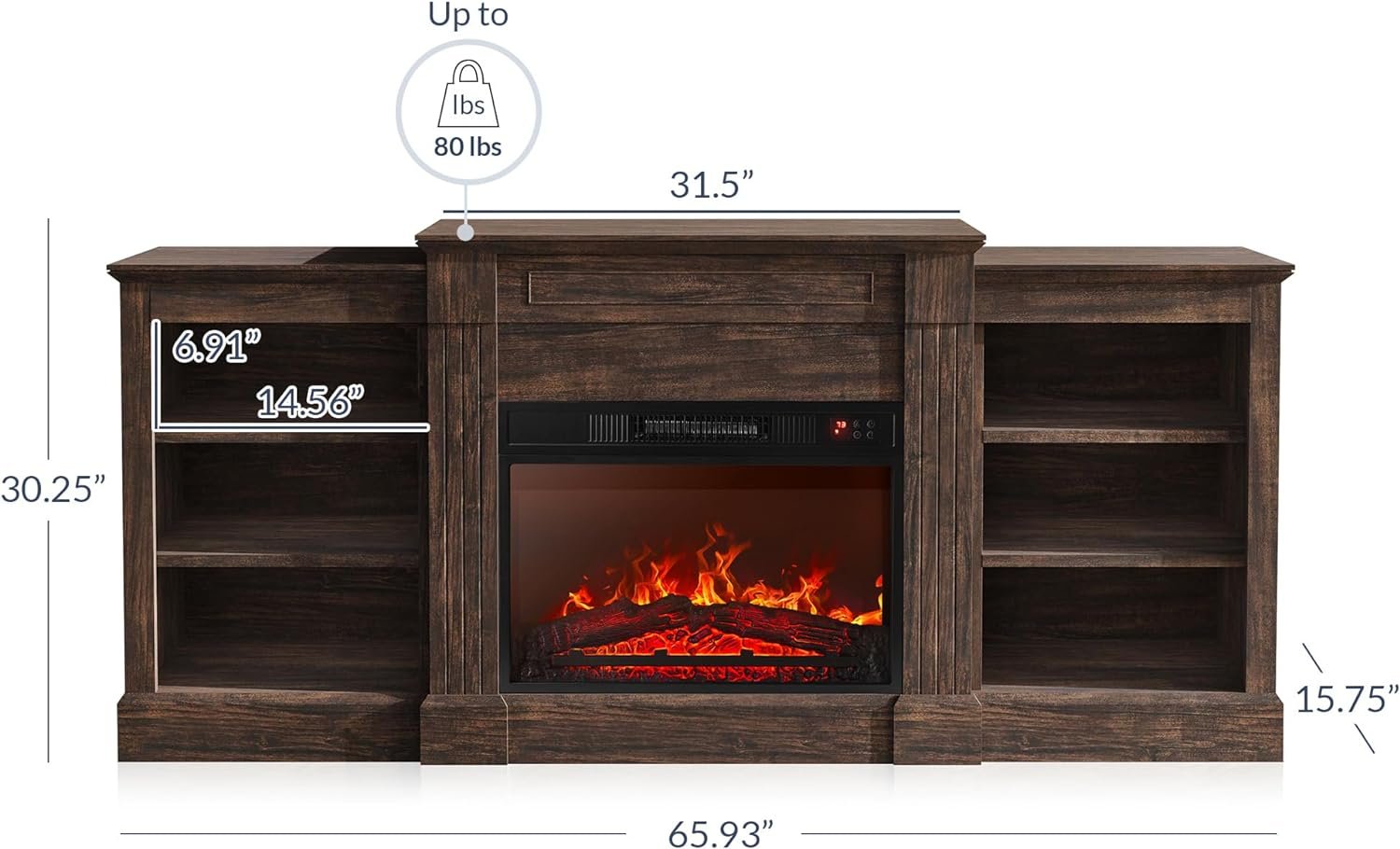 [BUILT-IN STORAGE] Built-in shelves and a mantel provide ample storage options. Safe self-regulating electric fireplace has protective glass that remains cool to the touch.