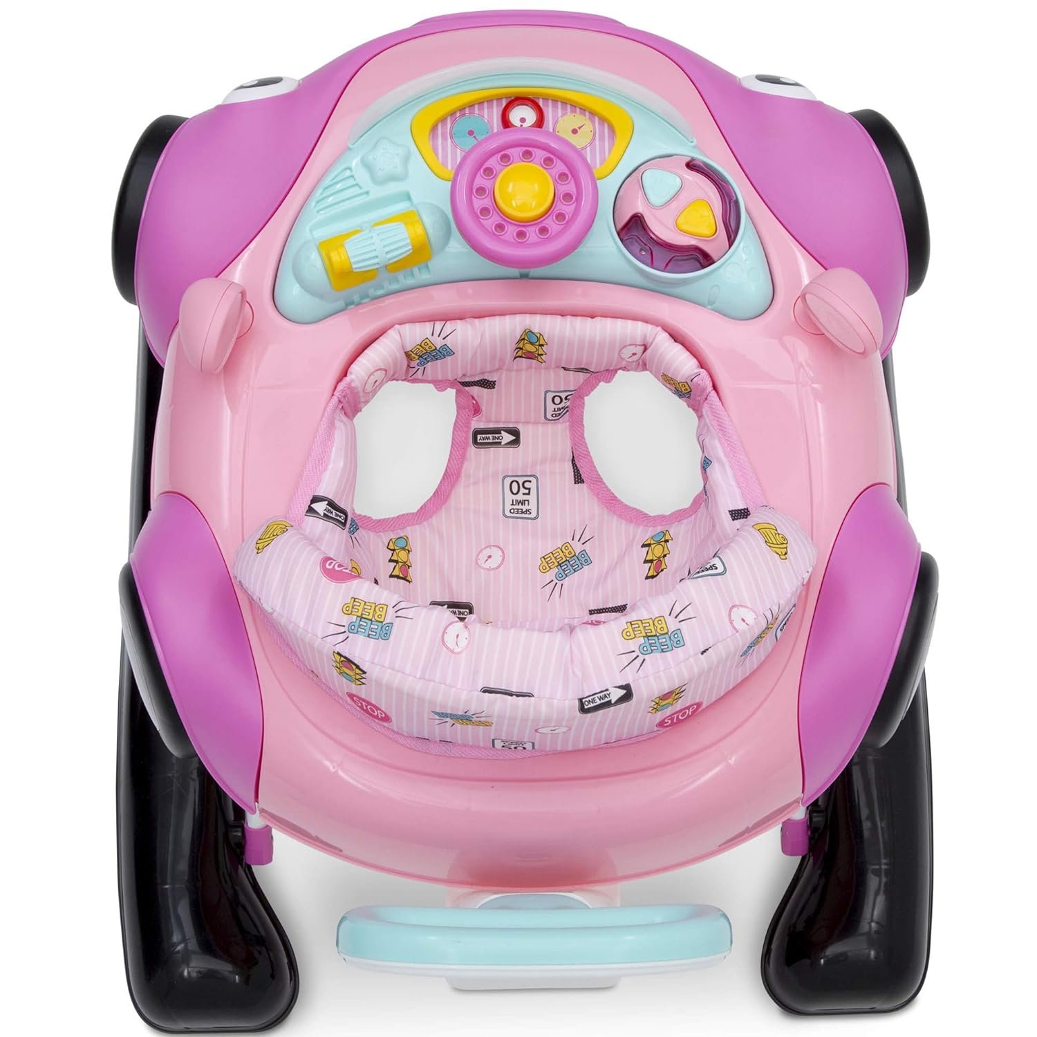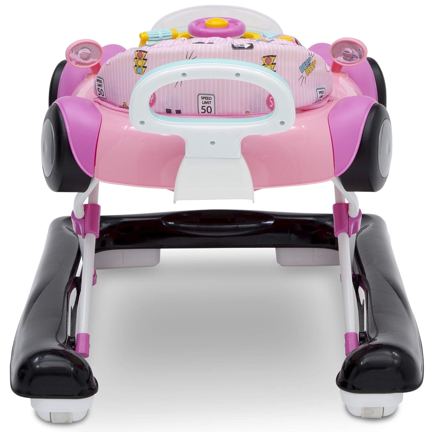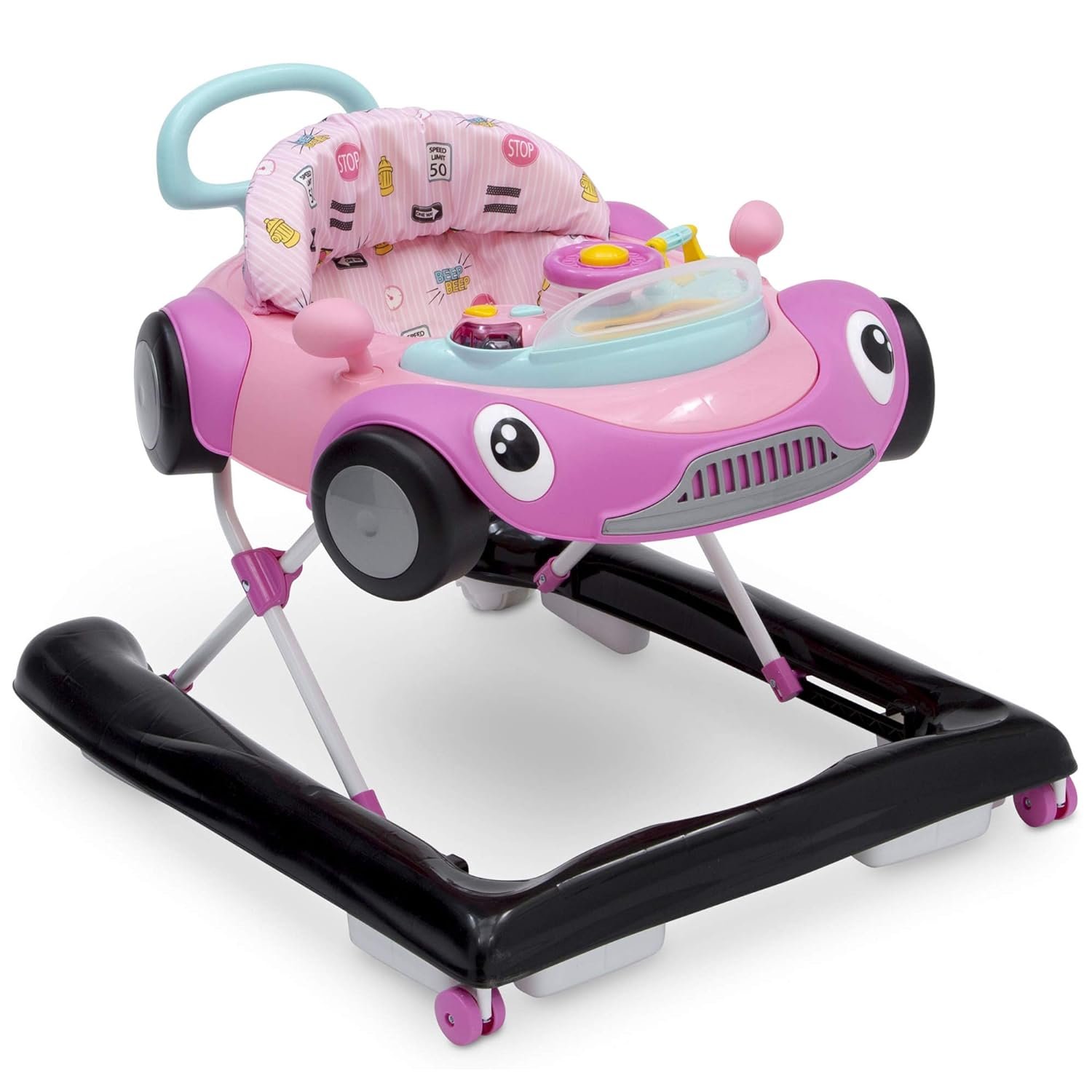 Baby will be off to the races in the First Race 2-in-1 Walker by Delta Children! Designed to stimulate early motor and cognitive skills, it is a perfect choice for your growing child with an innovative, 2-in-1 design that adapts to baby’s development. It transitions from an activity walker to a walk-behind walker turning baby’s first steps into an adventure of learning and discovery. As an activity walker, baby will enjoy engaging with all of the interactive features and toys from the comfort of the cushioned, high back chair. In the walk-behind mode, the walker’s easy-to-grasp handle offers additional support as your child begins to walk on their own. Designed to replicate a race car, this walker’s fun features include a movable steering wheel and horn to engage baby’s curiosity, stimulating their auditory and visual senses. The removable tray allows baby to take playtime anywhere and when playtime is over, it easily pops off the tray to reveal a generously sized eating surface, perfect for snack time. Offering the ideal support at each developmental stage, this walker features a 3-position height adjustment that grows with baby, and the chair cover is machine washable for easy cleaning. Available in Pink or Blue, the First Race Walker makes a great baby gift for boys or girls. Delta Children was founded around the idea of making safe, high-quality children’s furniture affordable for all families. They know there’s nothing more important than safety when it comes to your child’s space. That’s why all Delta Children products are built with long-lasting materials to ensure they stand up to years of jumping and playing. Plus, they are rigorously tested to meet or exceed all industry safety standards.