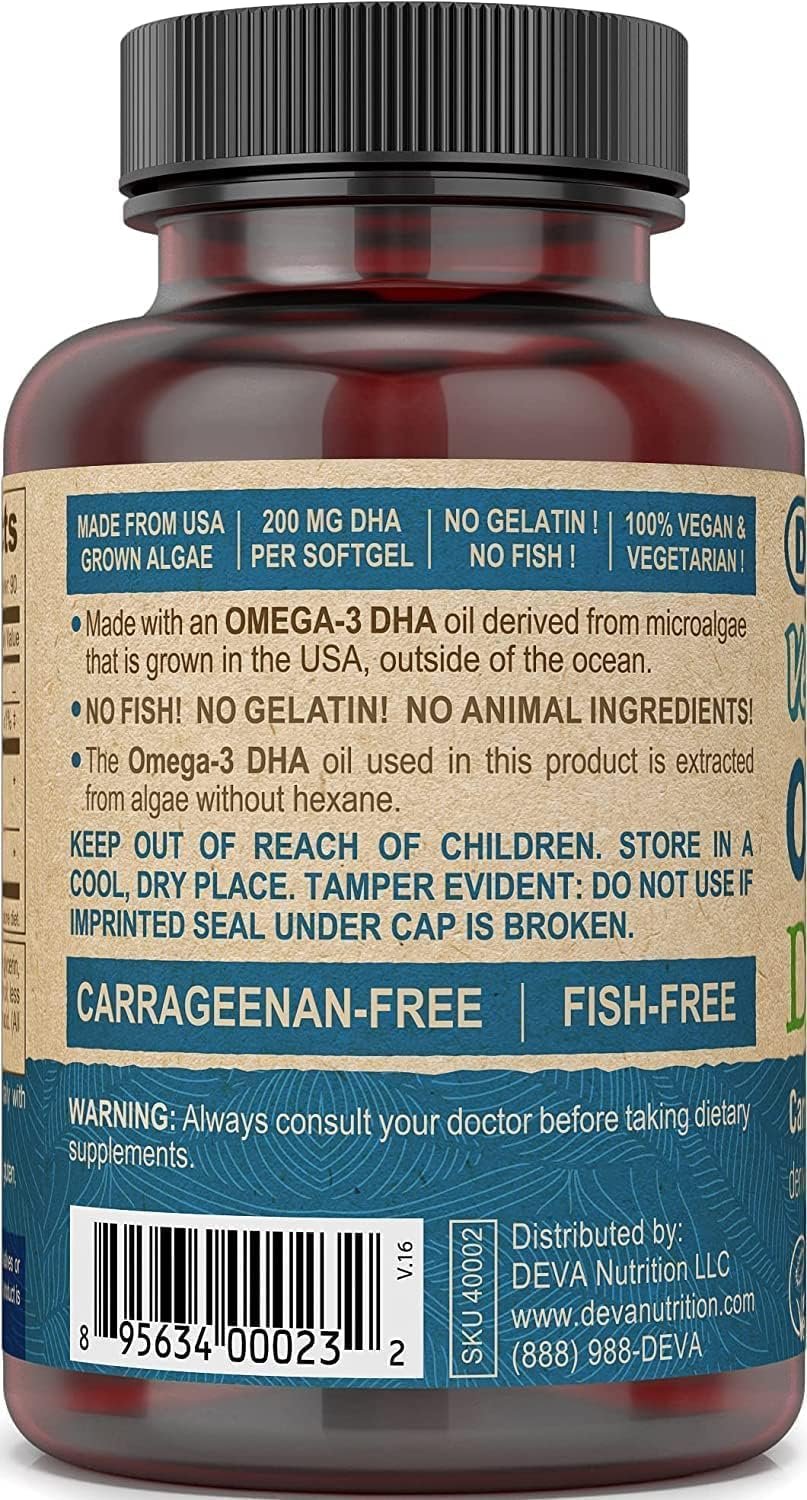 NON-FISH DHA: Deva Vegan Omega-3 comes with 500 mg of Algae oil which will give you a total of 200 MG DHA per softgel. This algae omega-3 does not have a fishy taste. 90 Vegan softgels/bottle.