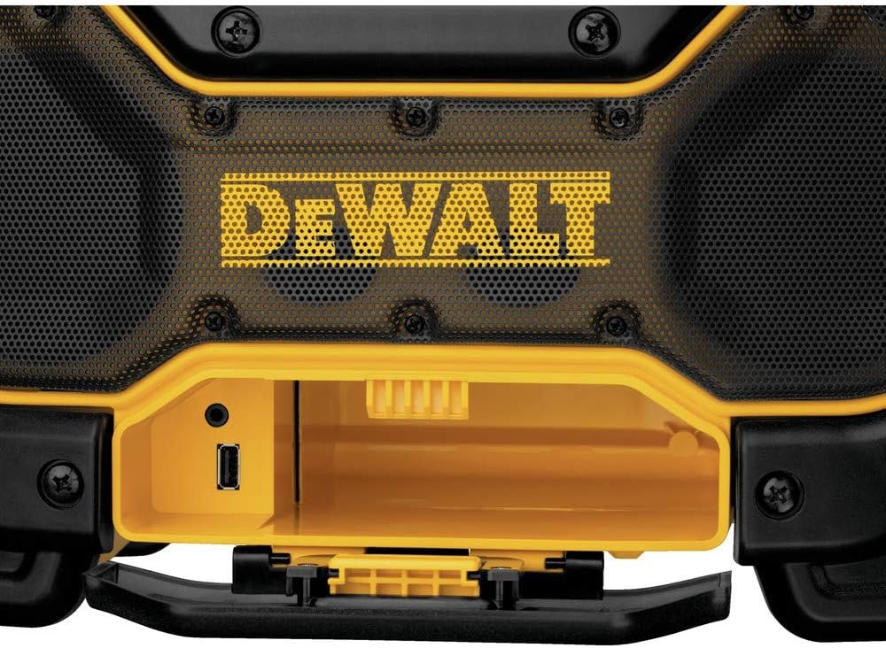 The DCR025 DEWALT radio charger is designed to be the most versatile Jobsite Radio Charger on the market. The unit is able to run off and charge DEWALT slide pack battery packs including 20V MAX* and FLEXVOLT 20V/60V MAX* at 3 AMPs when plugged into an AC outlet. The bluetooth radio speaker is designed to include woofers, tweeters and air ports to provide clear and rich sound at all volume levels. An over sized device storage box protects devices from worksite conditions and includes an Aux and 2.1 AMP USB charging port for convenient device charging. 2 AC Power outlets on the side of the unit allows you to plug in additional tools or chargers without occupying additional outlets on the wall. AVRCP (Audio Visual Remote Control Protocol) allows you to control your device from the radio interface so you can keep the device in a safe place and skip to the next song or hit replay on the radio interface.