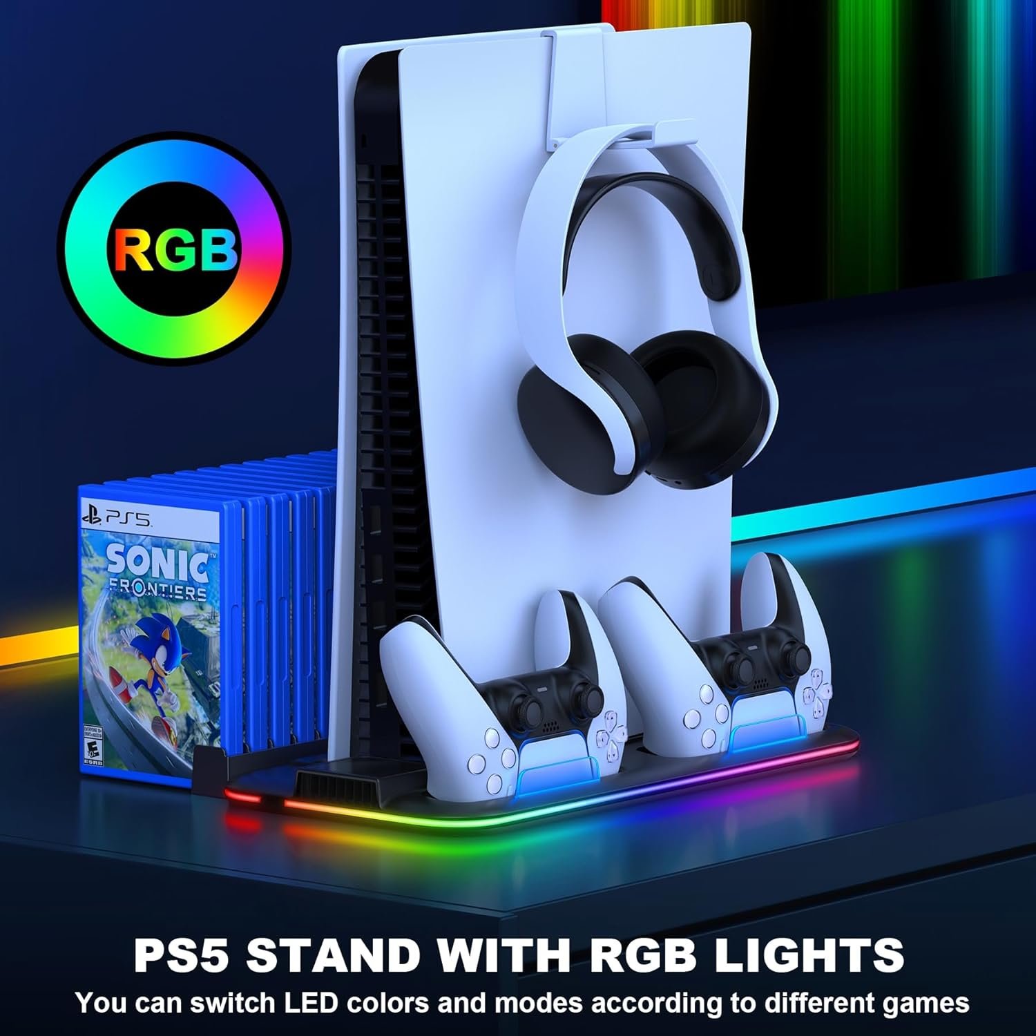 DINOSTRIKE PS5 Slim Cooling Station with RGB Light Dual Fast PS5 Controller Charging for Playstation 5 Slim Digital Disc Edition, PS5 Stand Vertical PS5 Accessories with Headset Holder 15 Game Slots