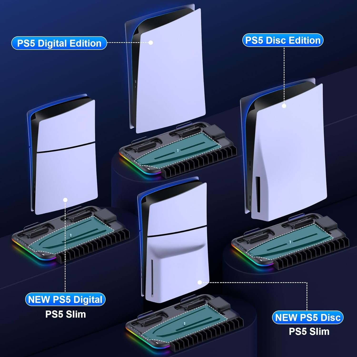 COMPATIBLE WITH NEWEST PS5 CONSOLES: The PS5 Cooler Stand is suitable for the latest version of PS5 Slim, and is also compatible with older PS5 Console Disc&Digital Edition. The cooling fan for playstation 5 base comes with a fixing screw and 4 non-slip silicone feet with strong adsorption, making the stand safer and more balanced on the table.The C to C cable is stored in the charging storage slot on the bottom of the PS5 charging cradle.