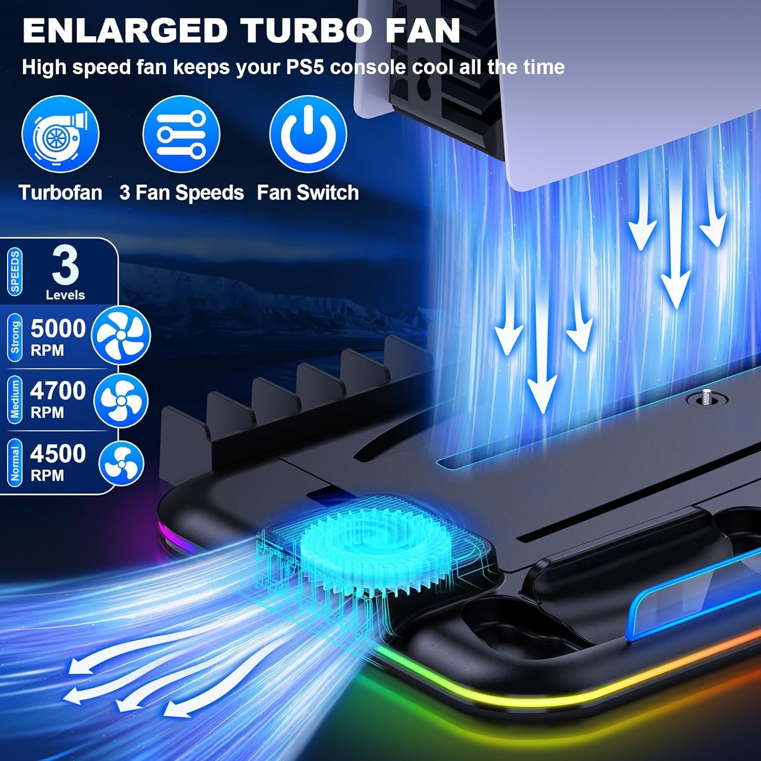 UPGRADED POWERFUL WIND SPEED: The PS5 slim stand has a built-in upgraded turbo fan with strong wind power. 3 adjustable wind speeds: strong/medium/normal, with a speed up to 5,000 RPM, which accelerates the air circulation inside the PS5 console, extracts the hot air from the bottom of the console, and dissipates the heat efficiently from the sides, keeping your P5 console cool and noiseless, providing a more stable gaming experience and extending the service life of the console.