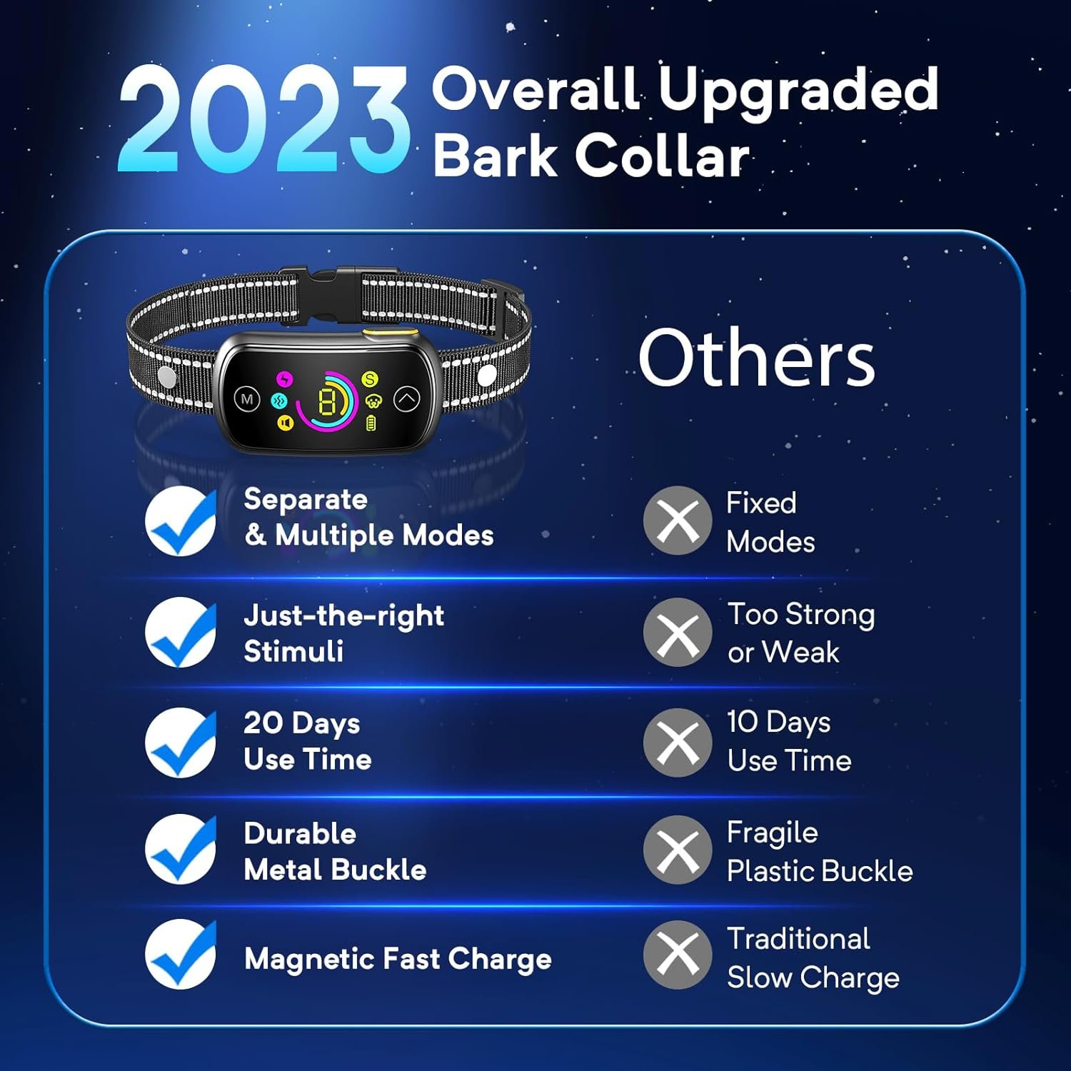 2023 Overall Upgraded Bark Collar: Our newly upgraded bark collar for large dog aims to elevate your training experience in every way possible. The battery life is extended to 20 days. To ensure durability, we especially uses the metal clasp instead of the plastic one, and processed the screen with IML tech, so the no bark collar is strong enough to survive every bite. What’s more, the large color screen is bright and easy to read day and night