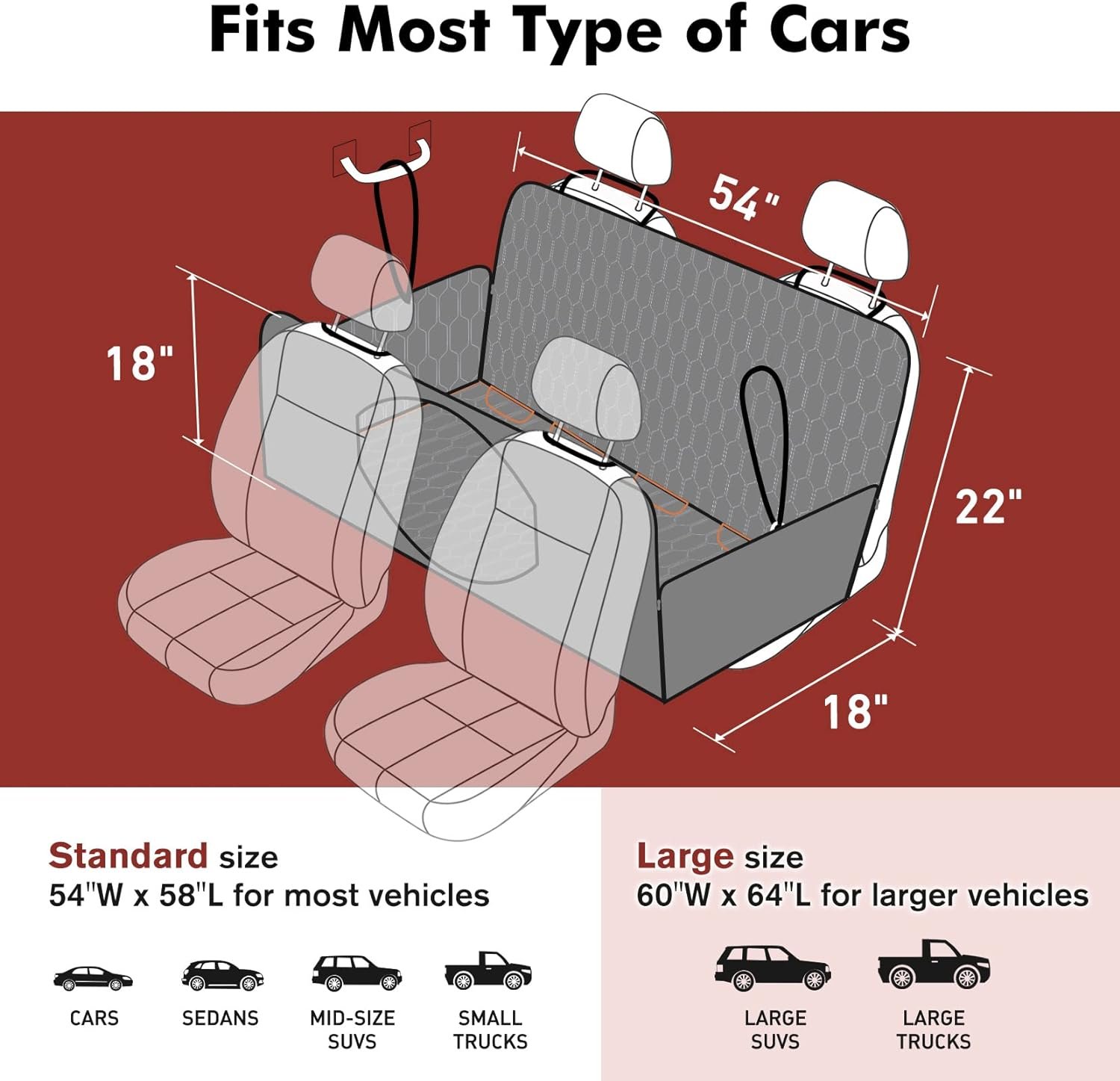 5 𝐈𝐍1 𝐌𝐔𝐋𝐓𝐈𝐅𝐔𝐍𝐂𝐓𝐈𝐎𝐍𝐀𝐋 𝐃𝐎𝐆 𝐒𝐄𝐀𝐓 𝐂𝐎𝐕𝐄𝐑, 𝐔𝐍𝐈𝐕𝐄𝐑𝐒𝐀𝐋 𝐒𝐈𝐙𝐄 𝐅𝐎𝐑 𝐌𝐎𝐒𝐓 𝐂𝐀𝐑𝐒: Our pet car cover back seat protector is a versatile accessory that functions as a ①dog hammock with side wings, ②bench car seat cover, ③trunk cargo liner, ④dog seat style, ⑤camping mat. Universal size of 54″ W x 58″ L, making it perfect for most cars, including limousines, family cars, trucks, and SUVs. It covers the entire back seat for ultimate protection, ensuring hassle-free rides and worry-free family excursions. With our pet car cover, you can enjoy the company of your furry friend without damaging your car.