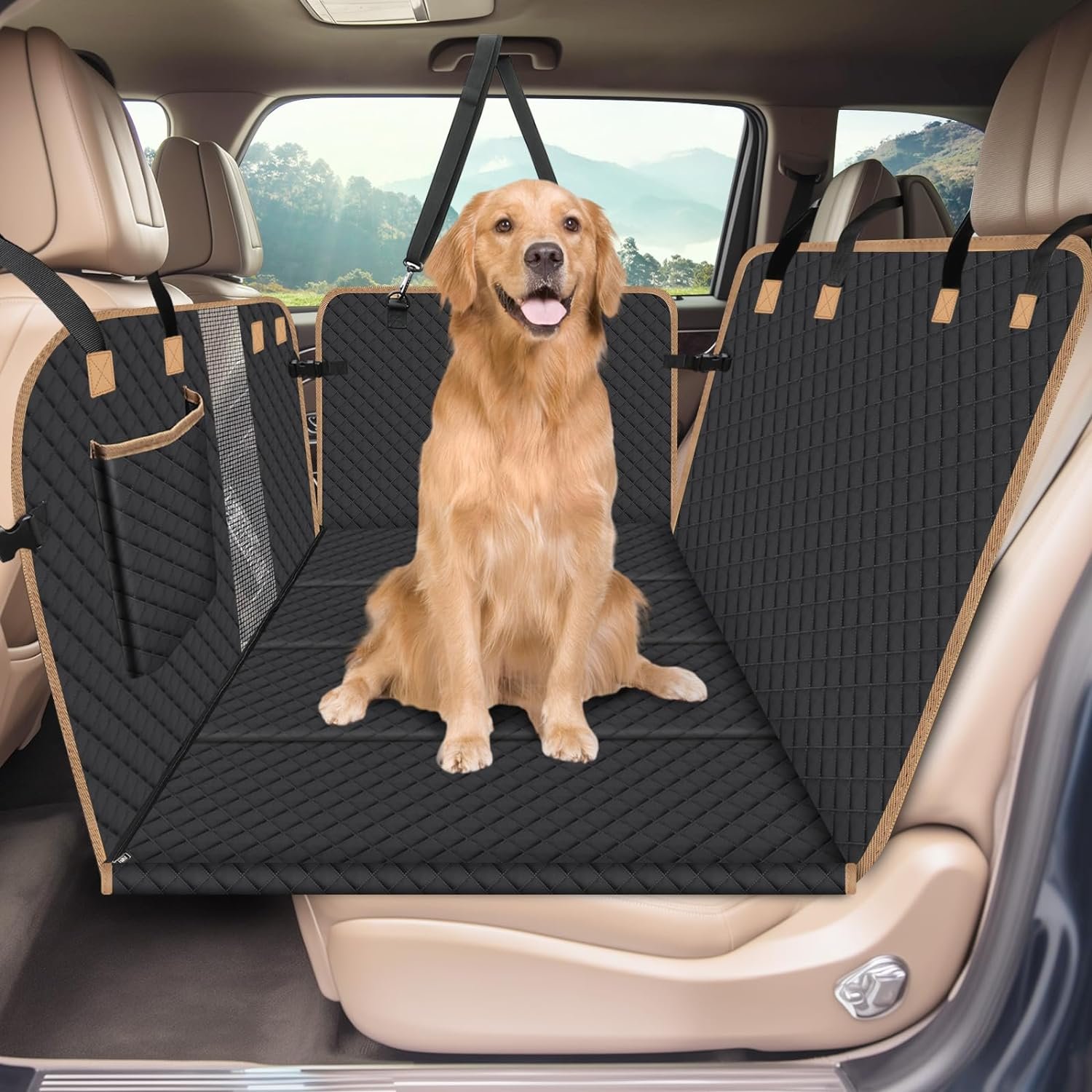 【Easy Installation】Just open the car travel cover bed and spread it to the back seats.Hang the straps on the car seat headrest poles and armrests; Buckle up all buckles. There is an additional dog car seat belt for dog safety. Just clip the buckle into pet’s choker and fasten the other one into seat buckle.