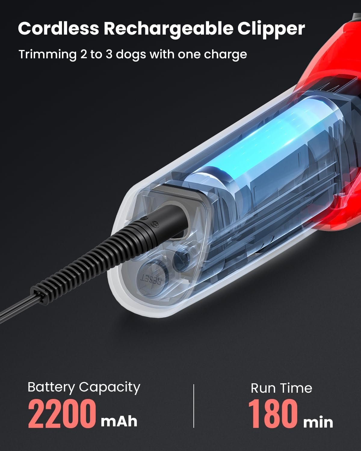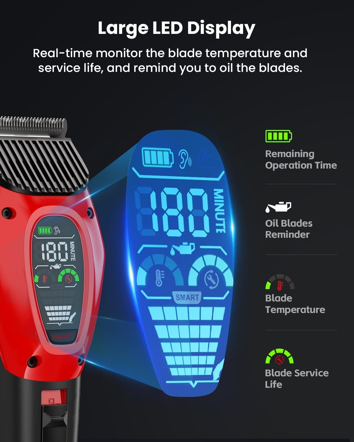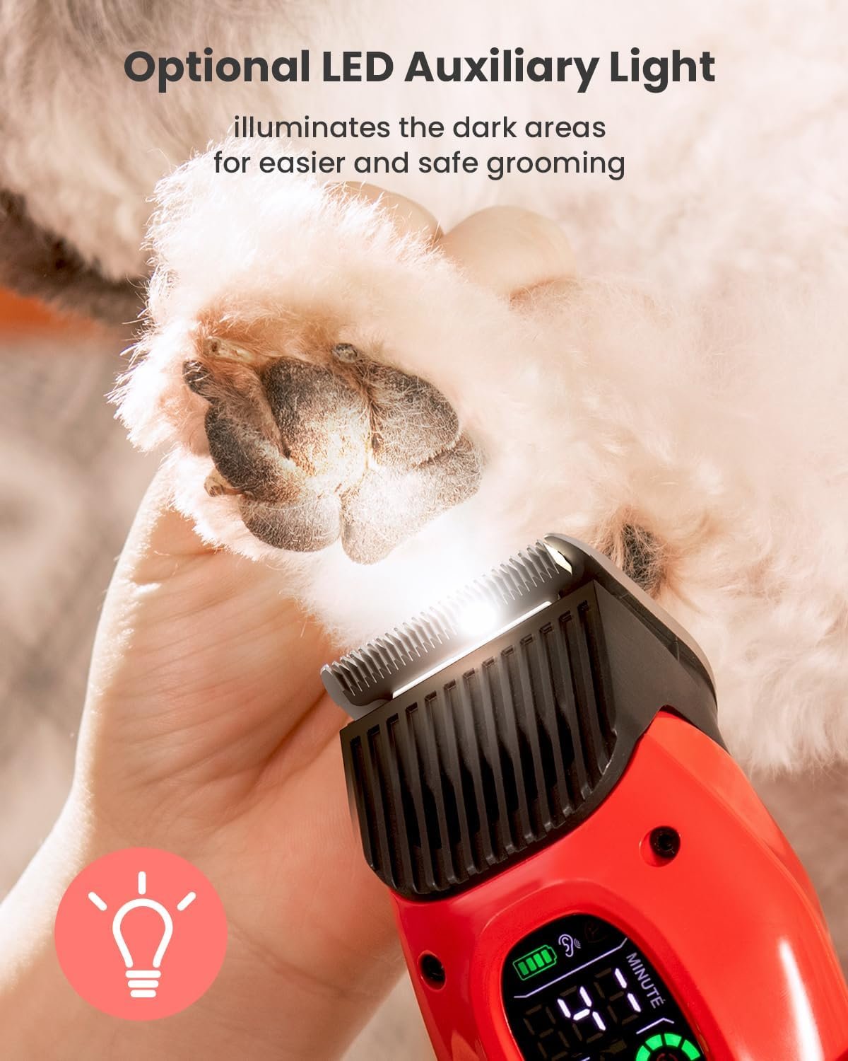 【Better Control with Auxiliary Lighting and LED Display】Auxiliary Lighting ensures you have a clear view by Illuminates tricky areas like the paws, underarms and the hygiene area. Besides, large led display will show you the real-time status of the electric clippers like clipping speed, blade service life, remaining operation time, oil blades reminder. Trimming becomes easier and safer.